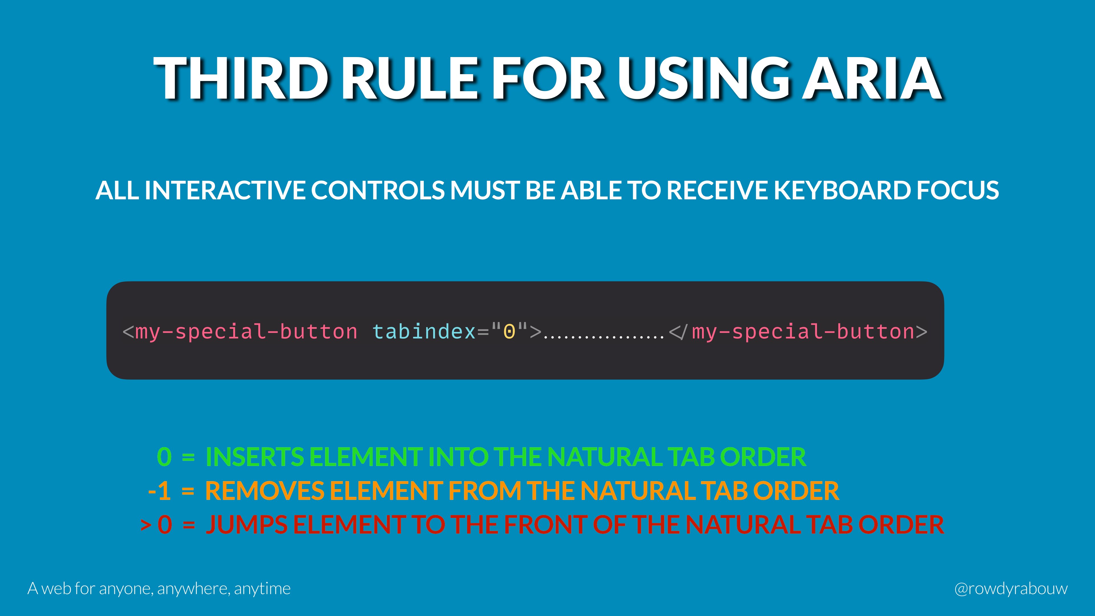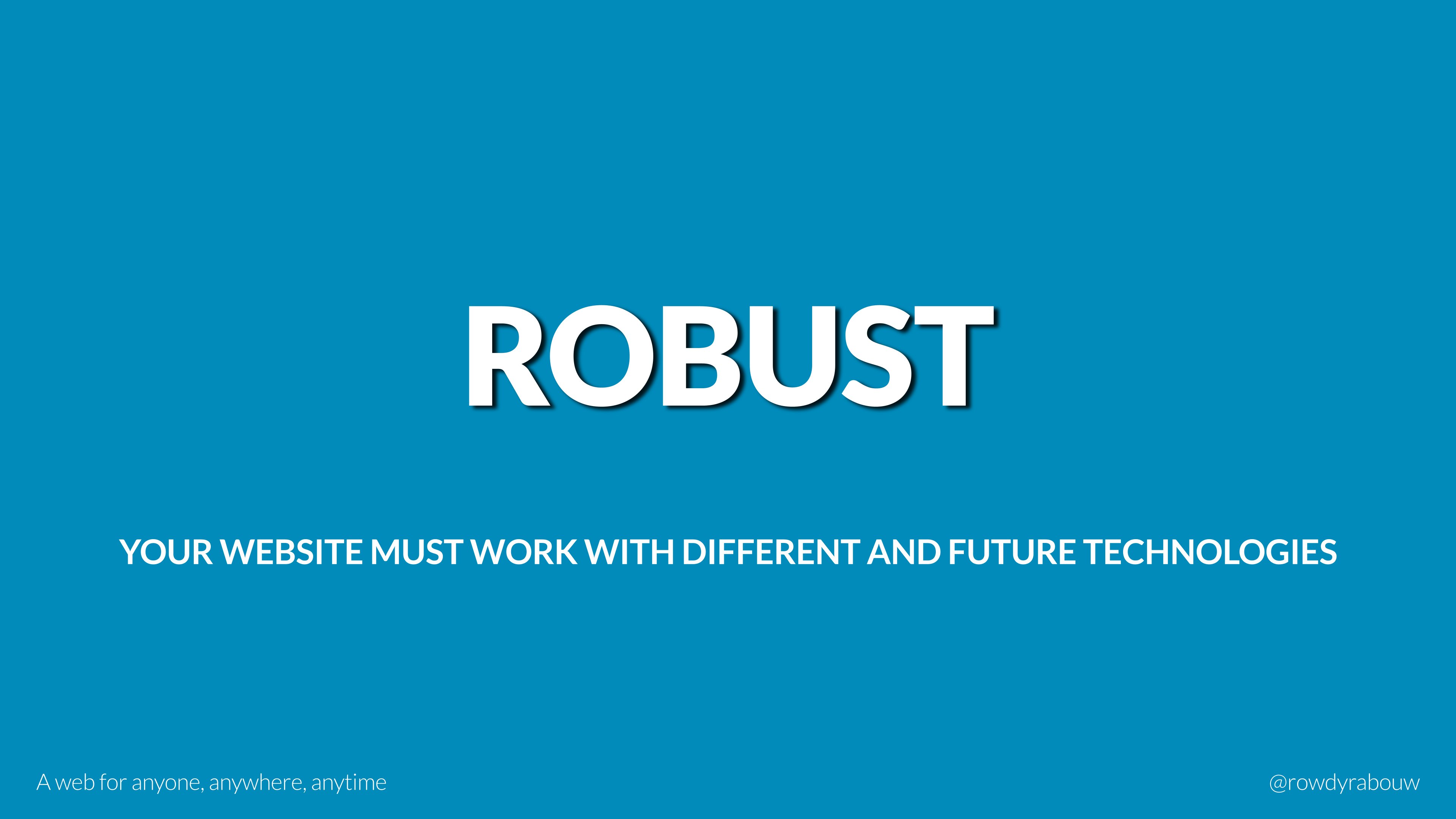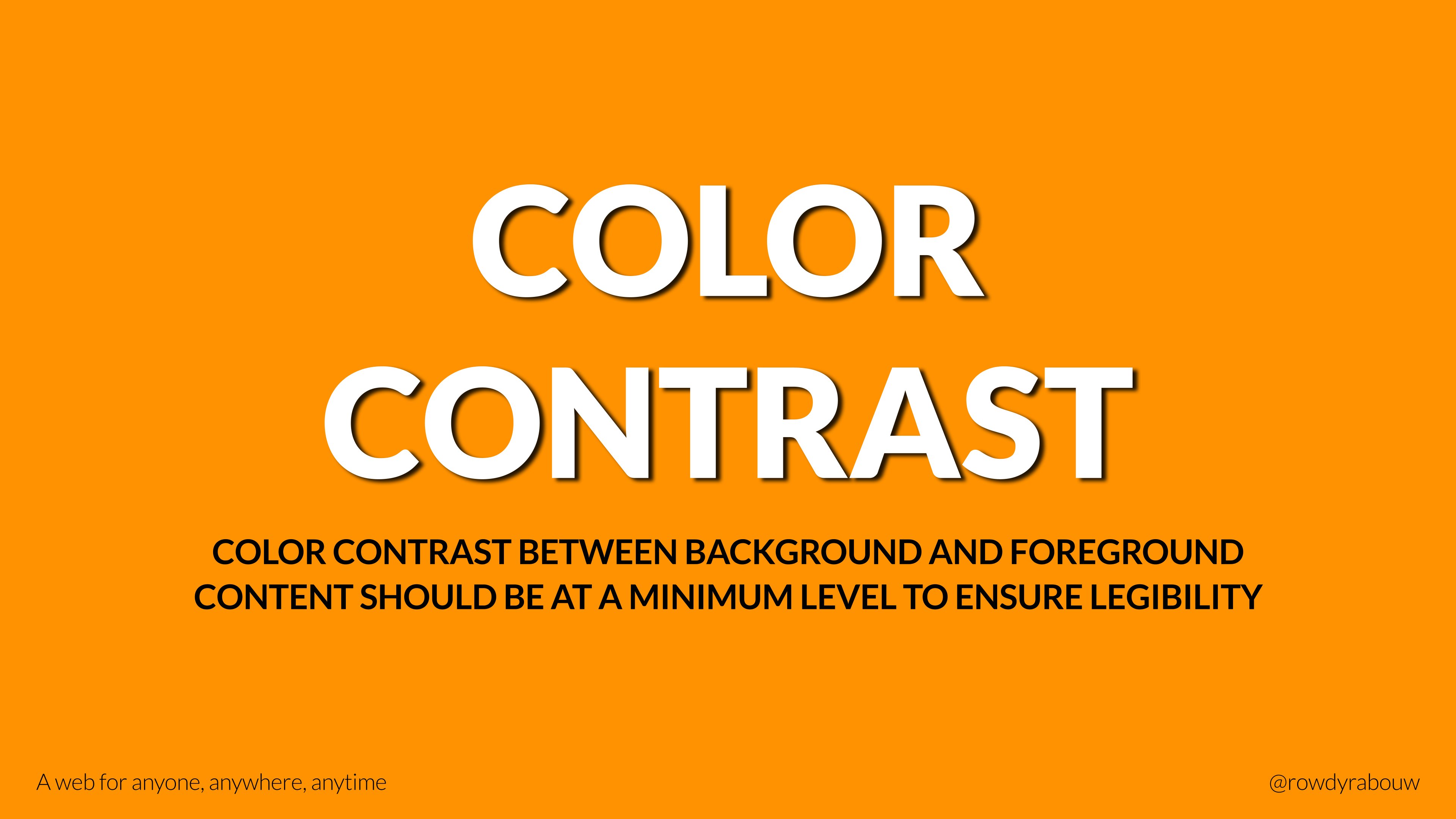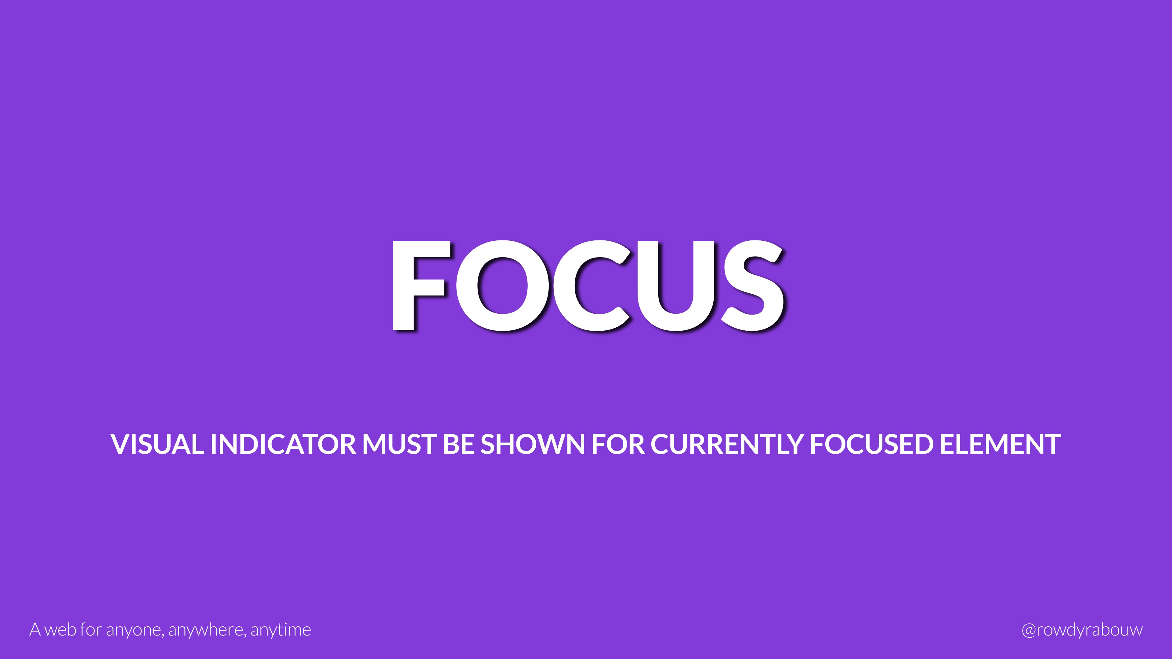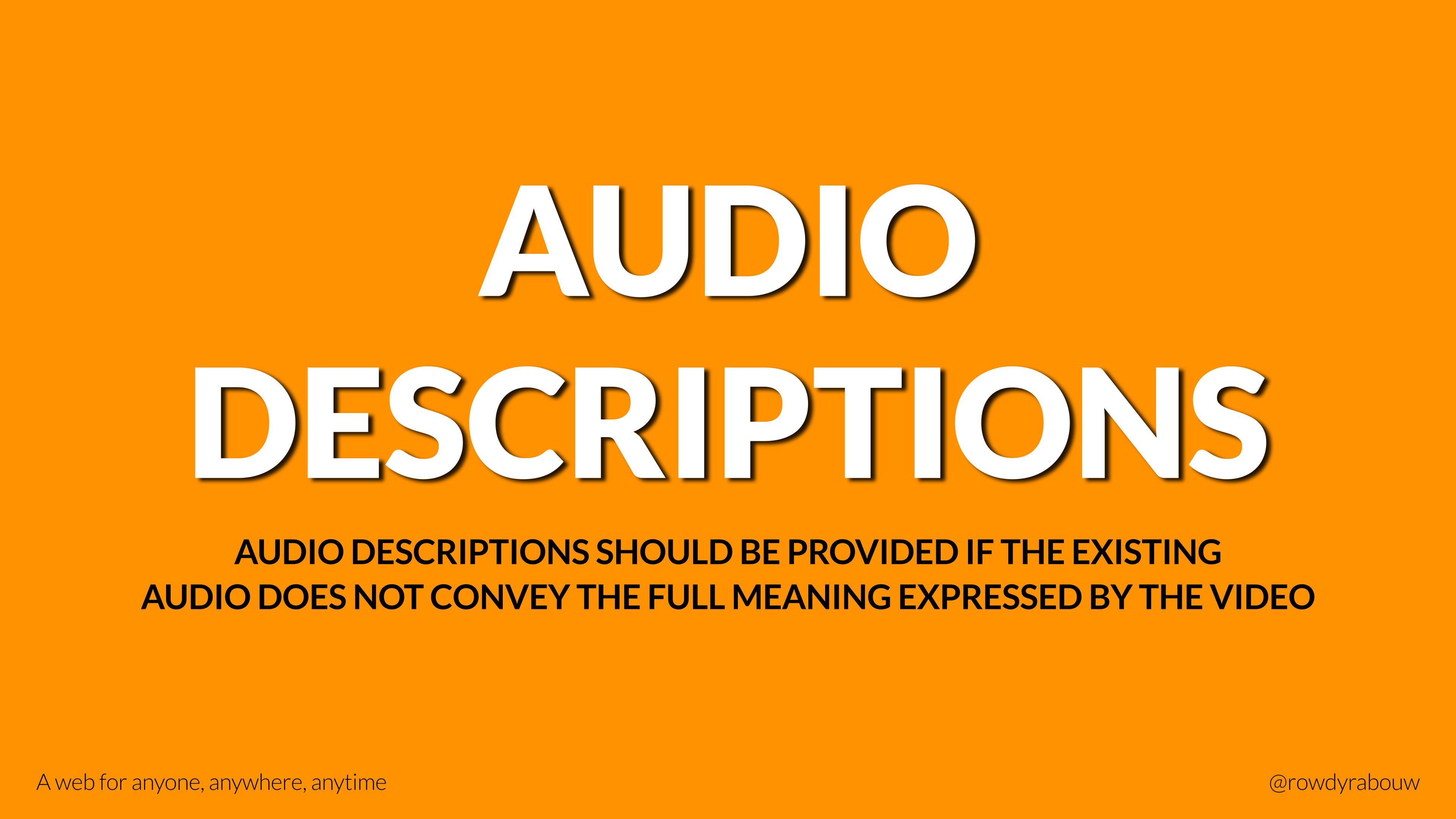 In this talk, Rowdy will go over common mistakes and show solutions to improve your website for persons with disabilities. He will also show practical examples to make websites more enjoyable and usable for everyone, based on their current situation.