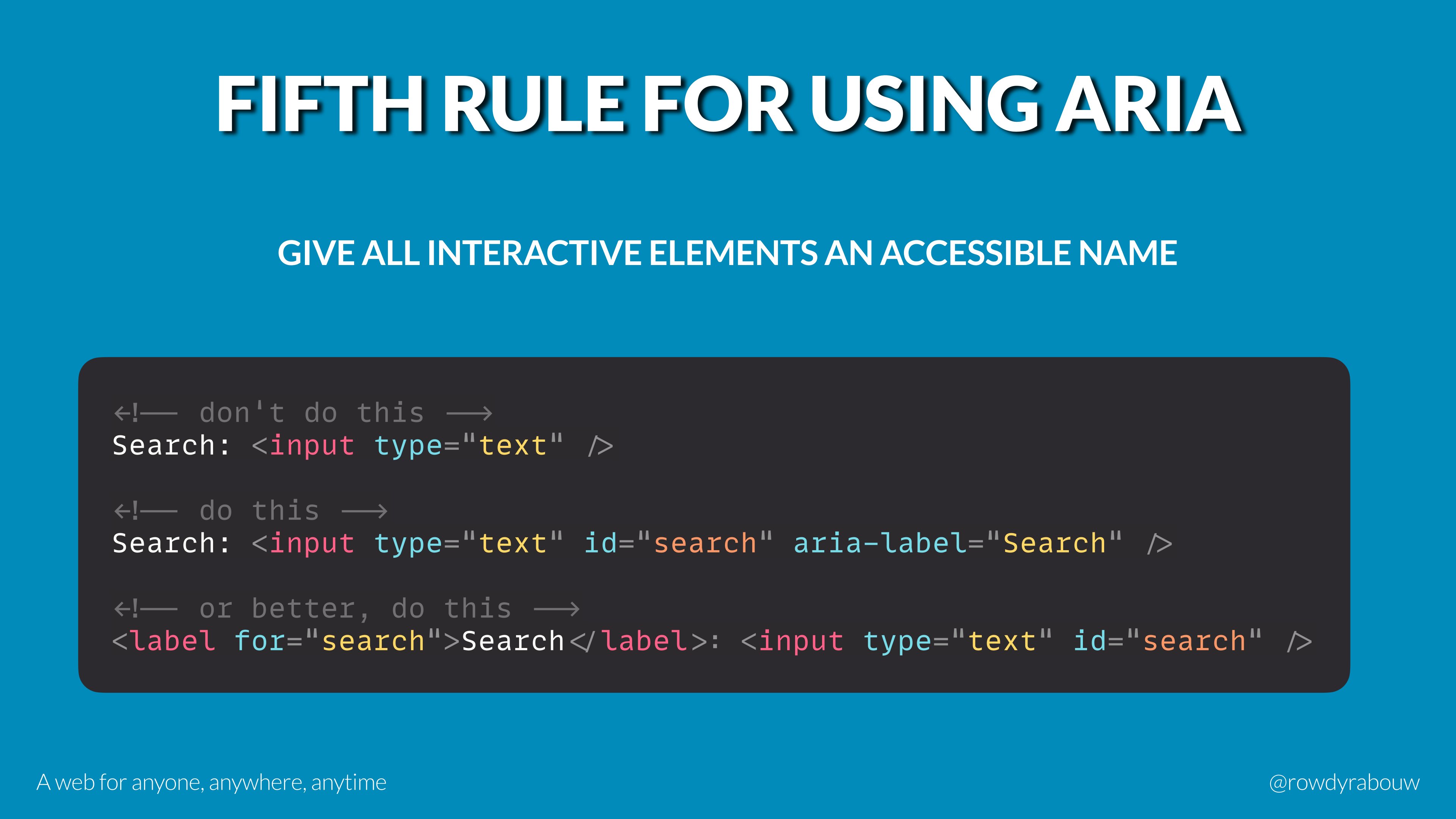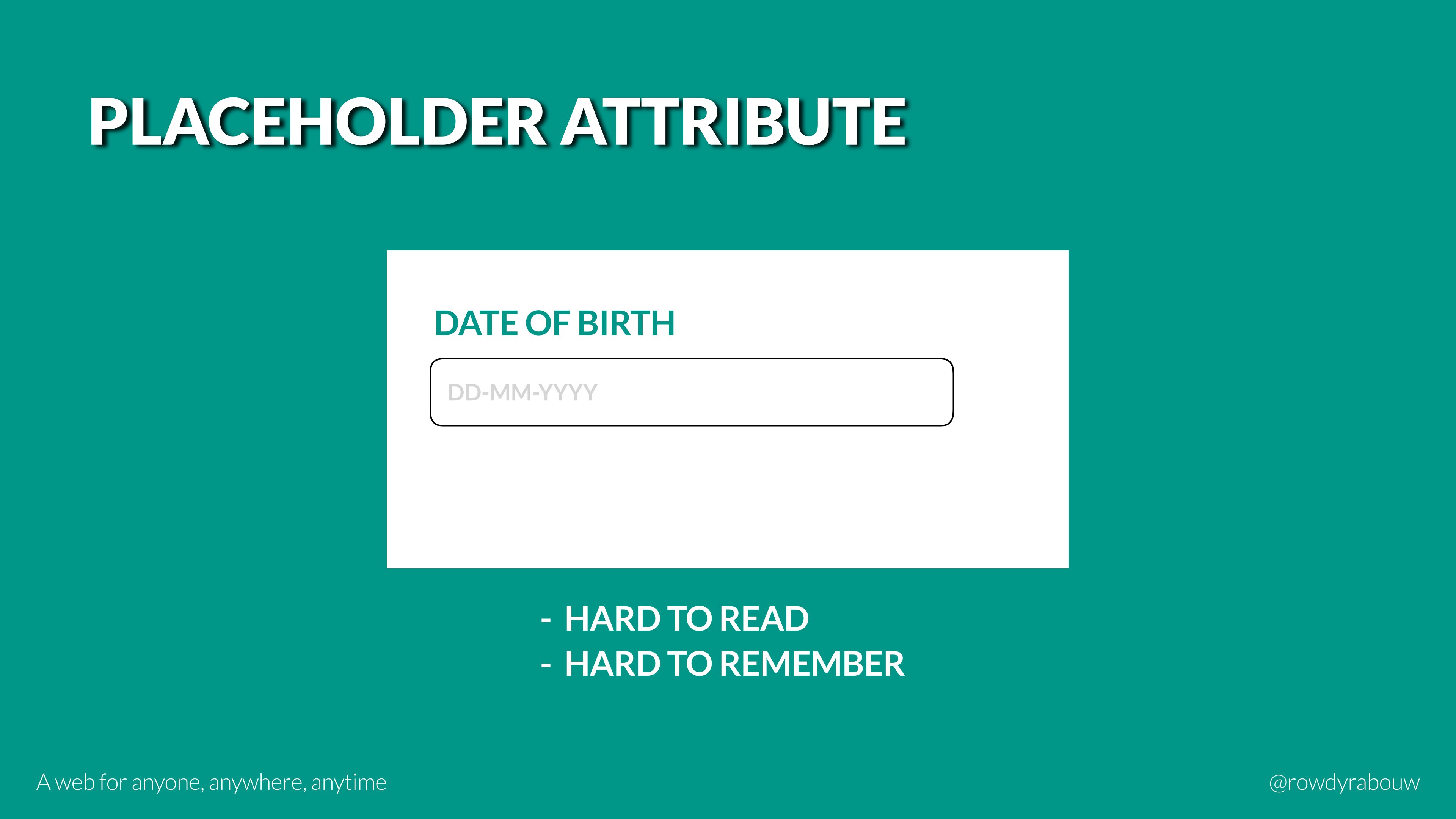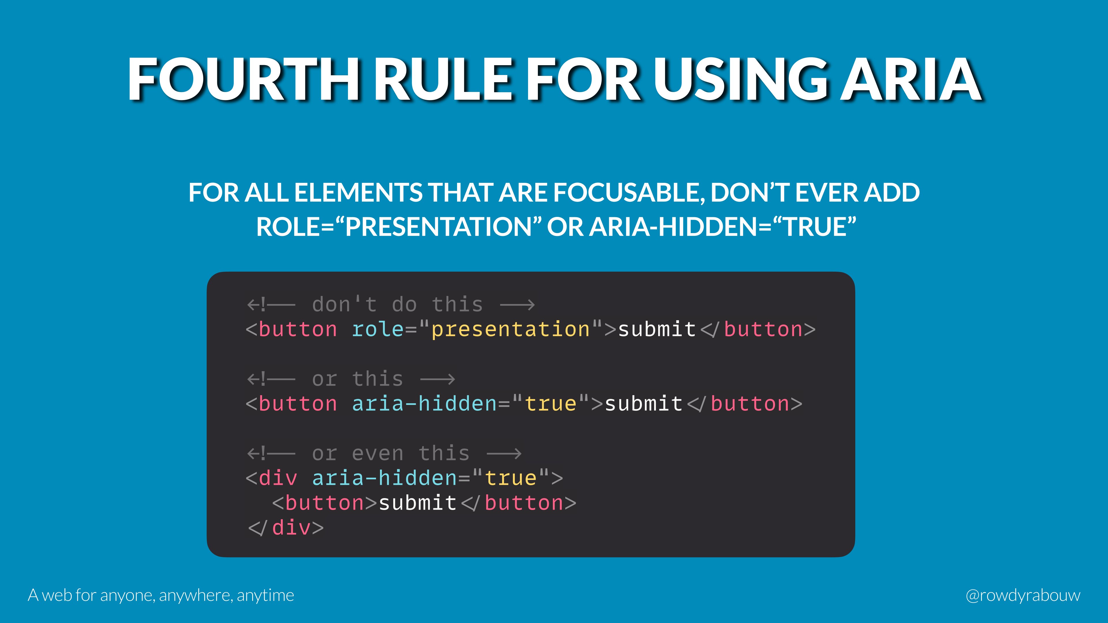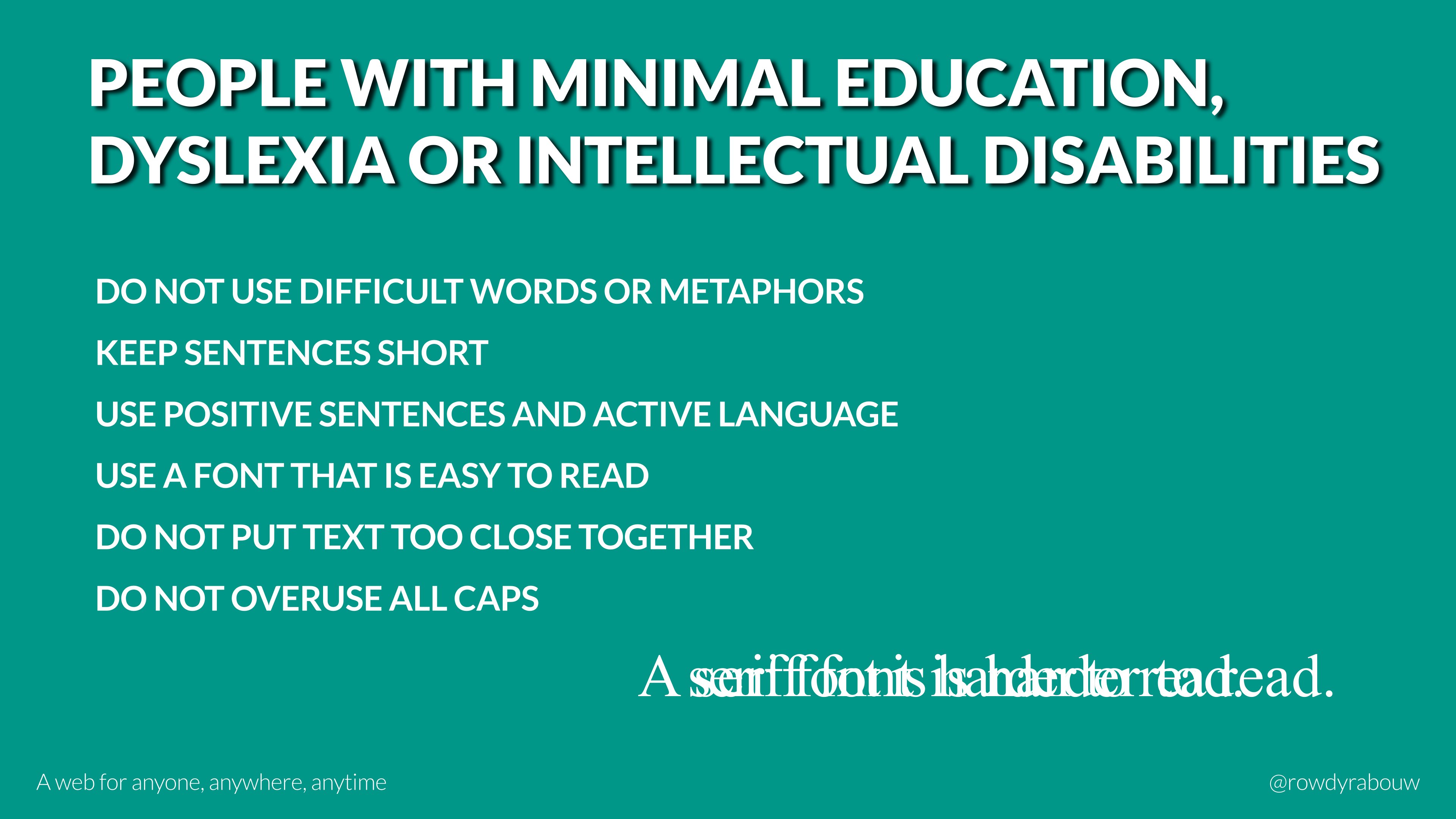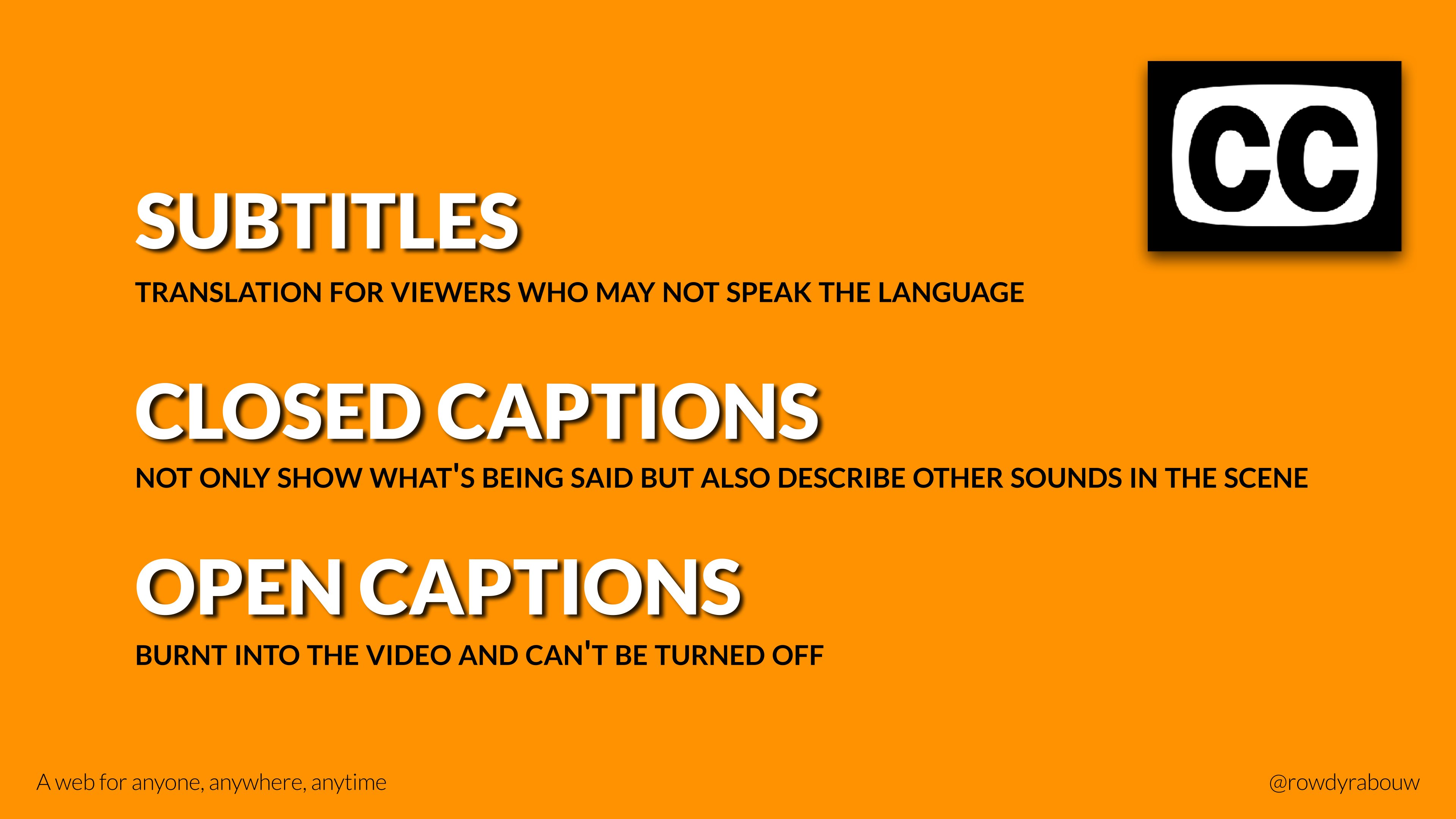 In this talk, Rowdy will go over common mistakes and show solutions to improve your website for persons with disabilities. He will also show practical examples to make websites more enjoyable and usable for everyone, based on their current situation.