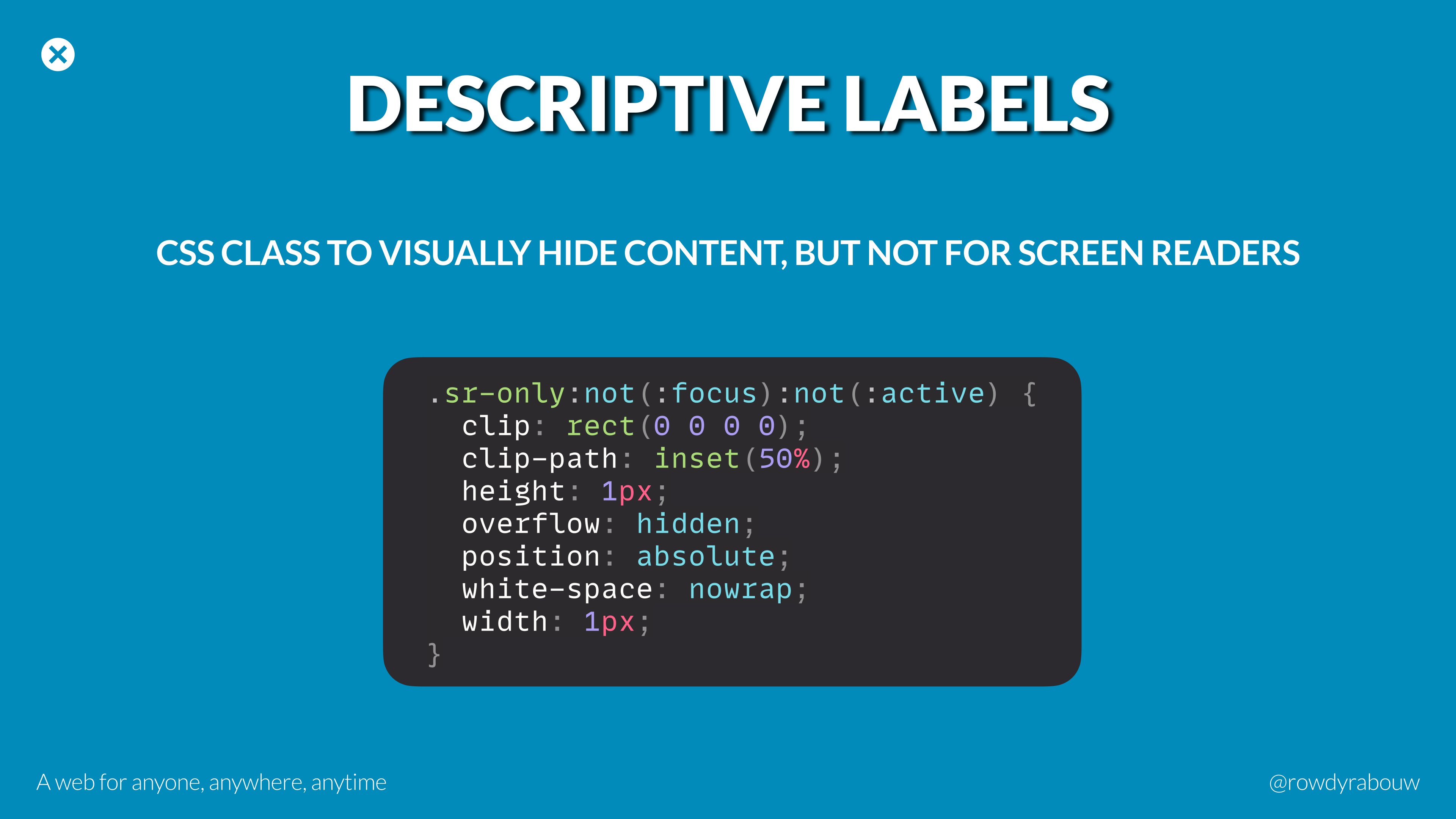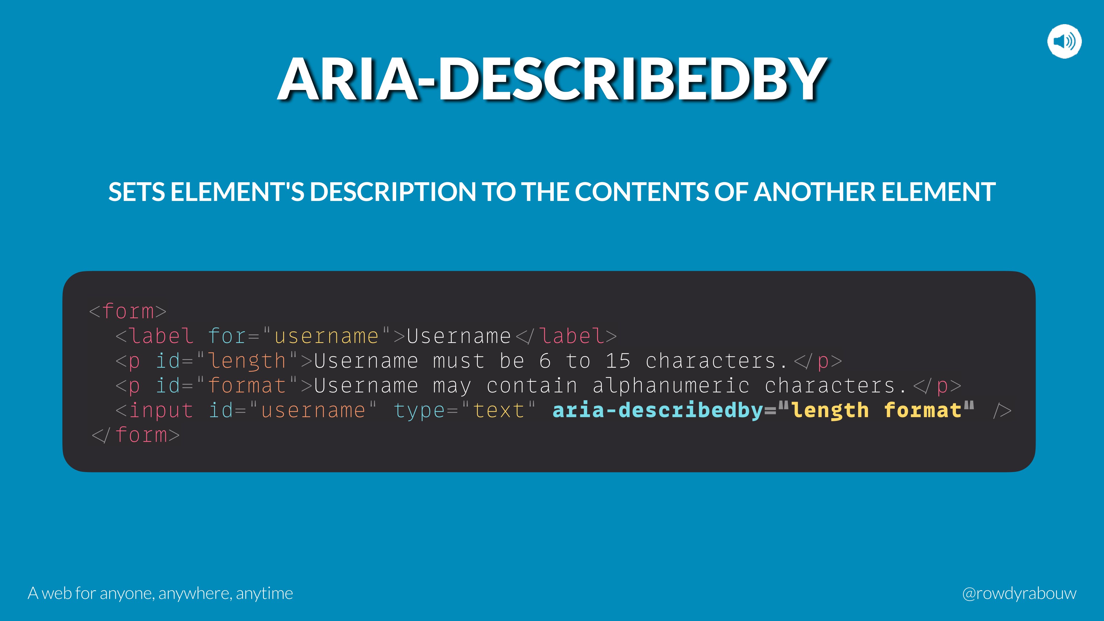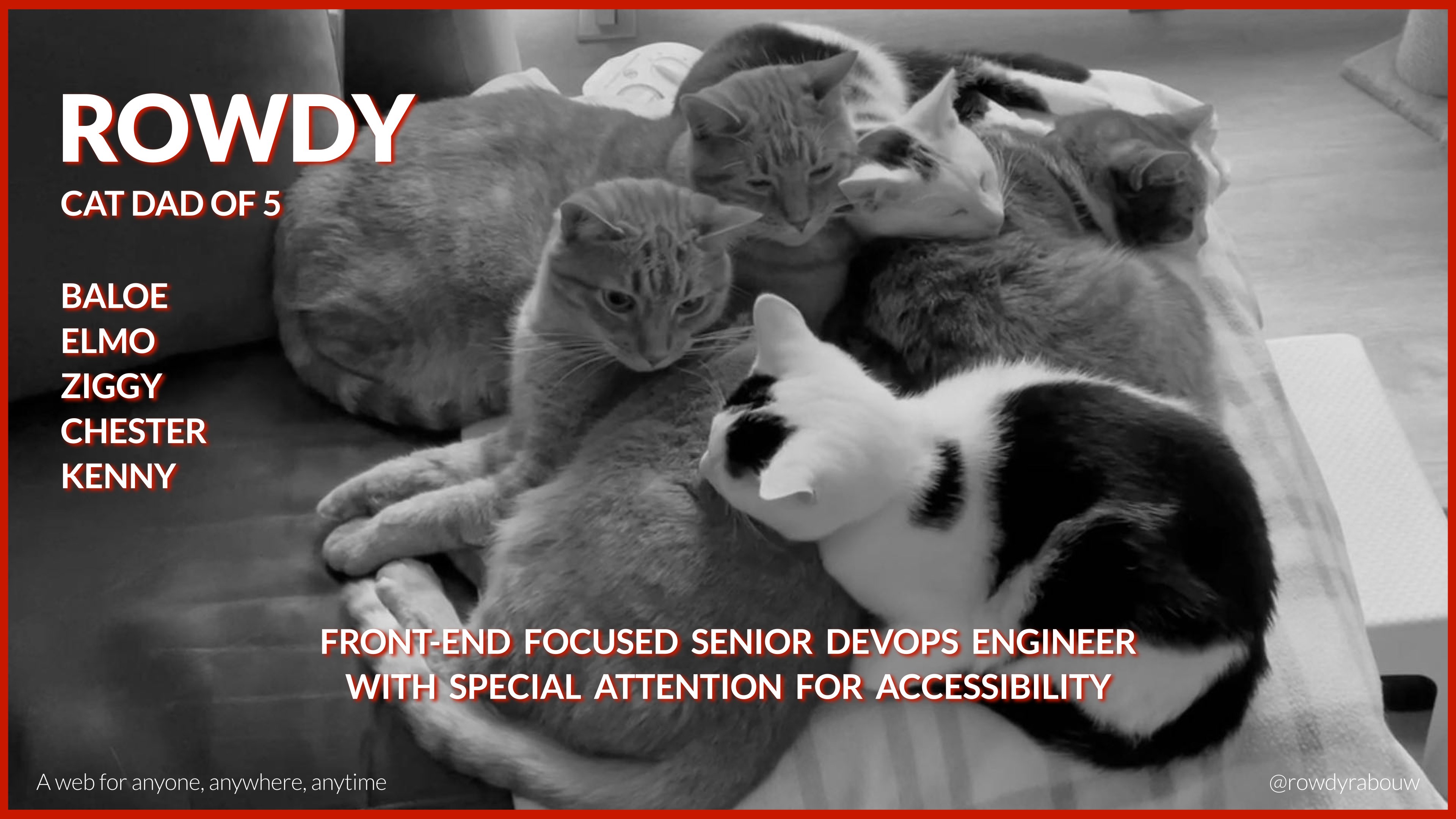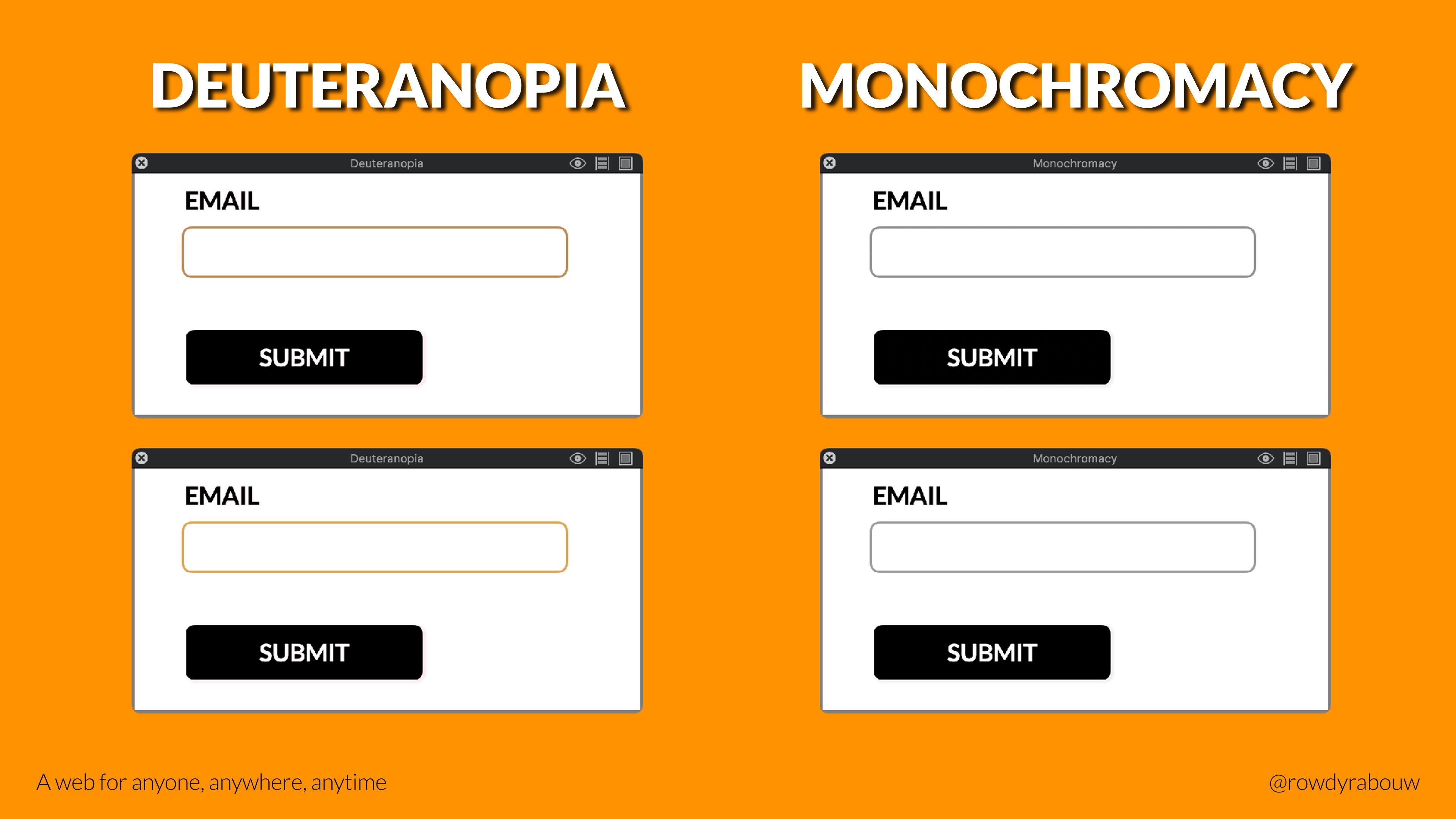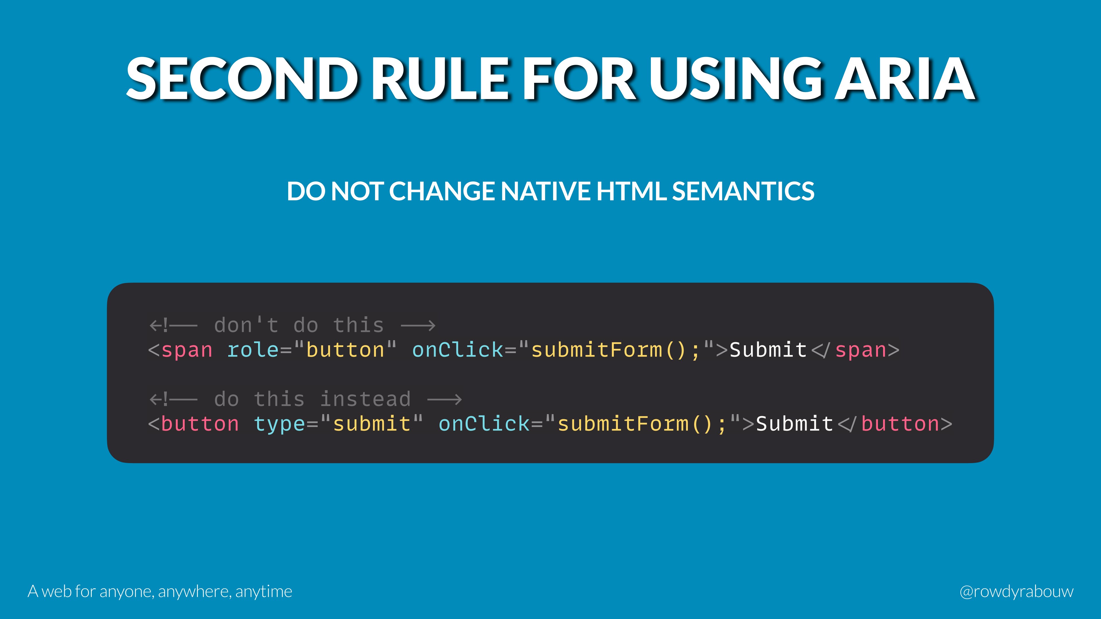 In this talk, Rowdy will go over common mistakes and show solutions to improve your website for persons with disabilities. He will also show practical examples to make websites more enjoyable and usable for everyone, based on their current situation.