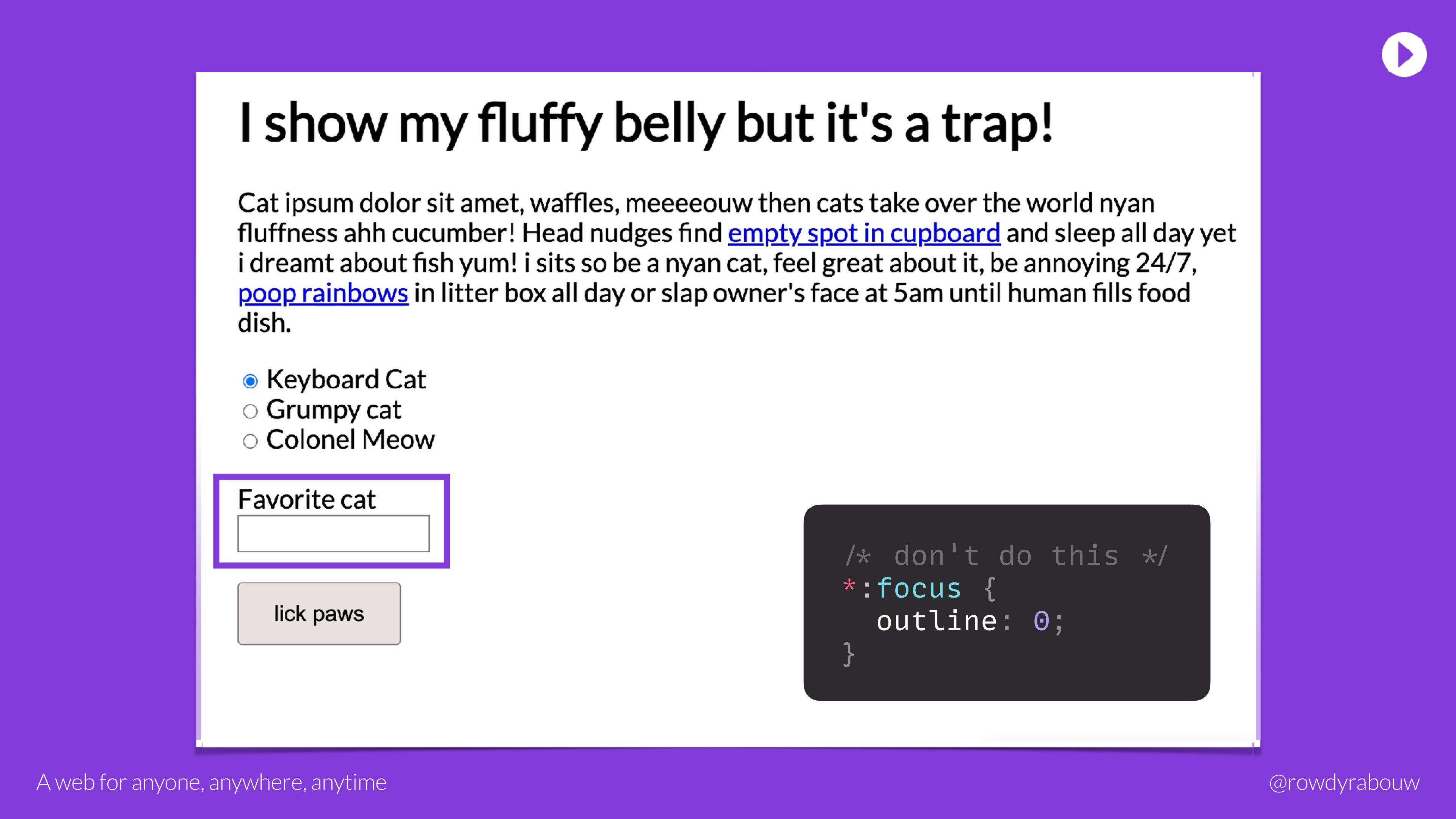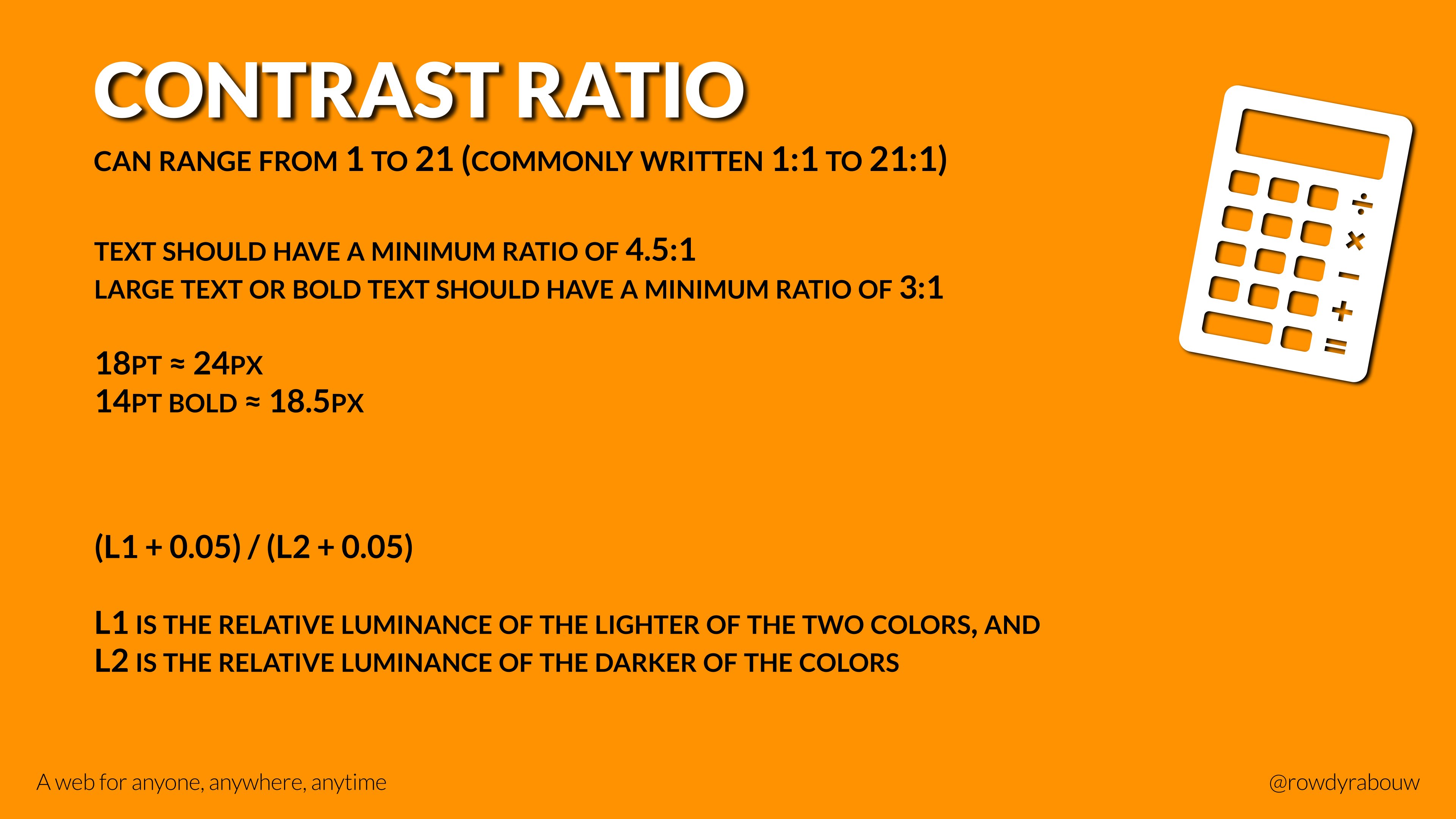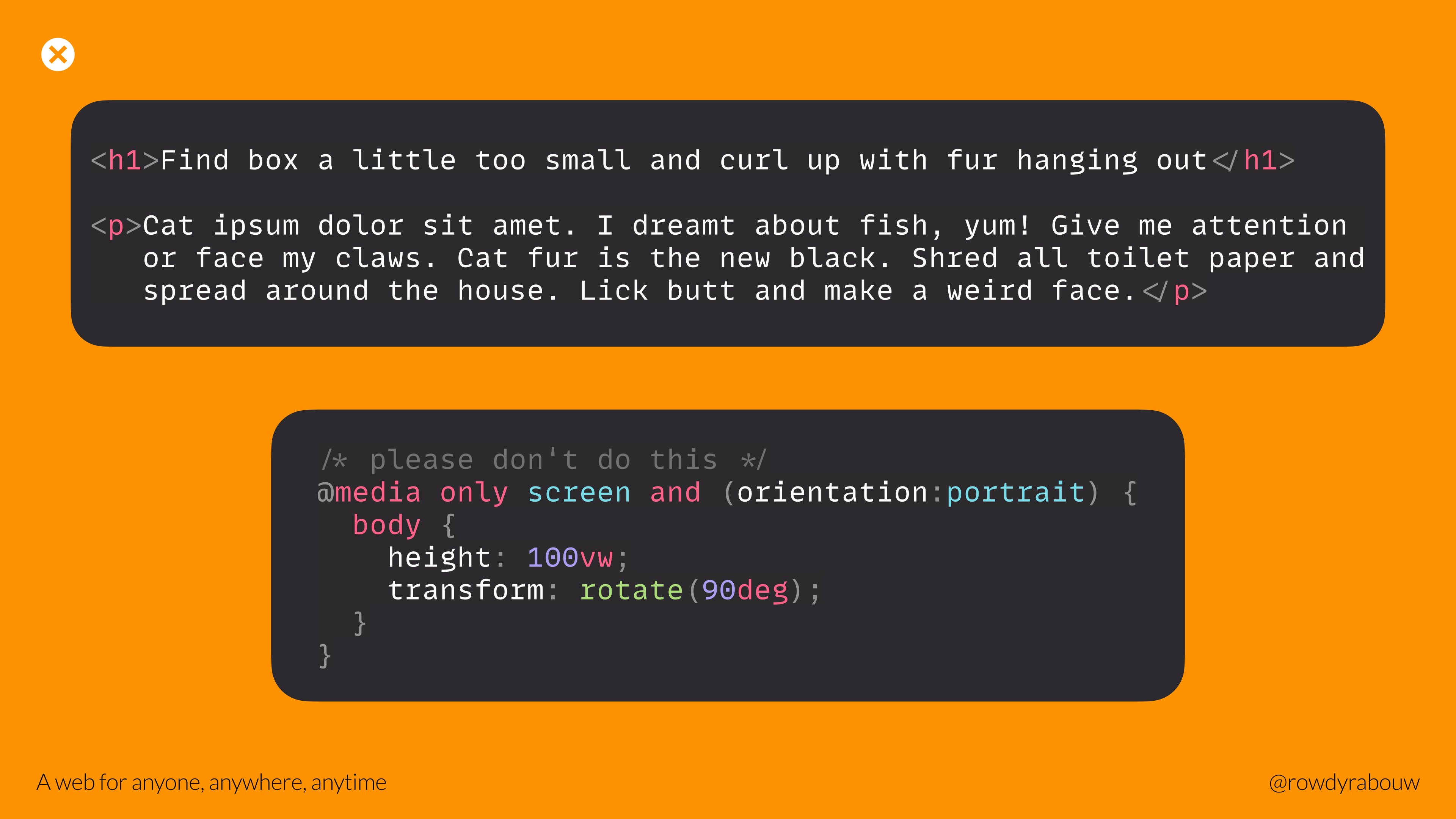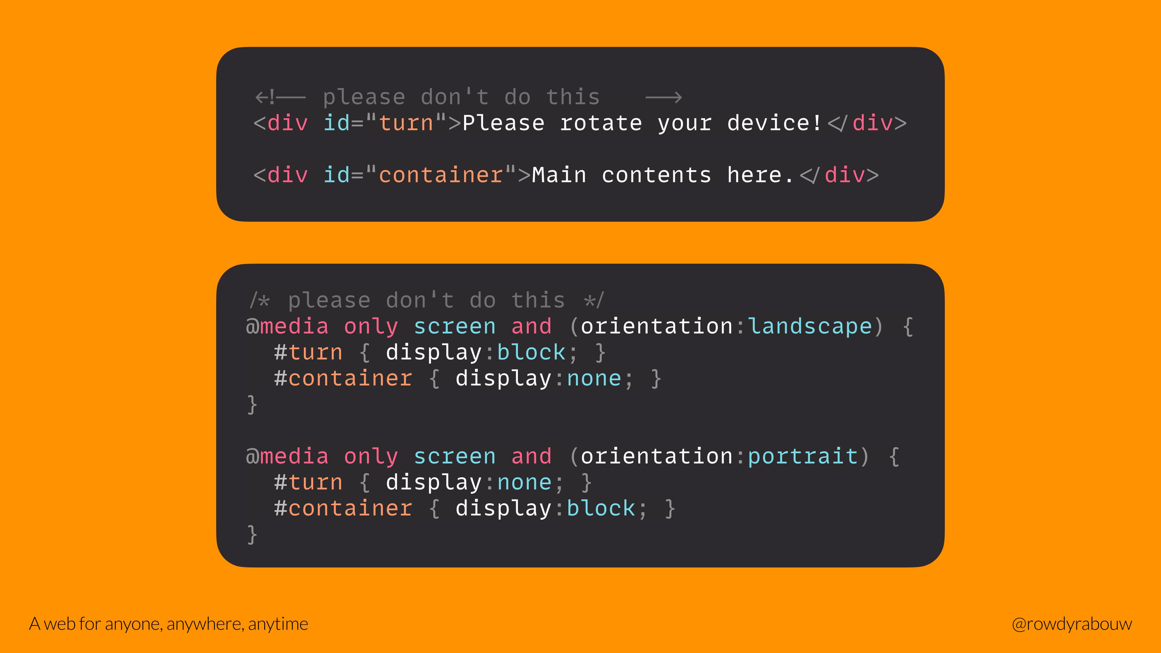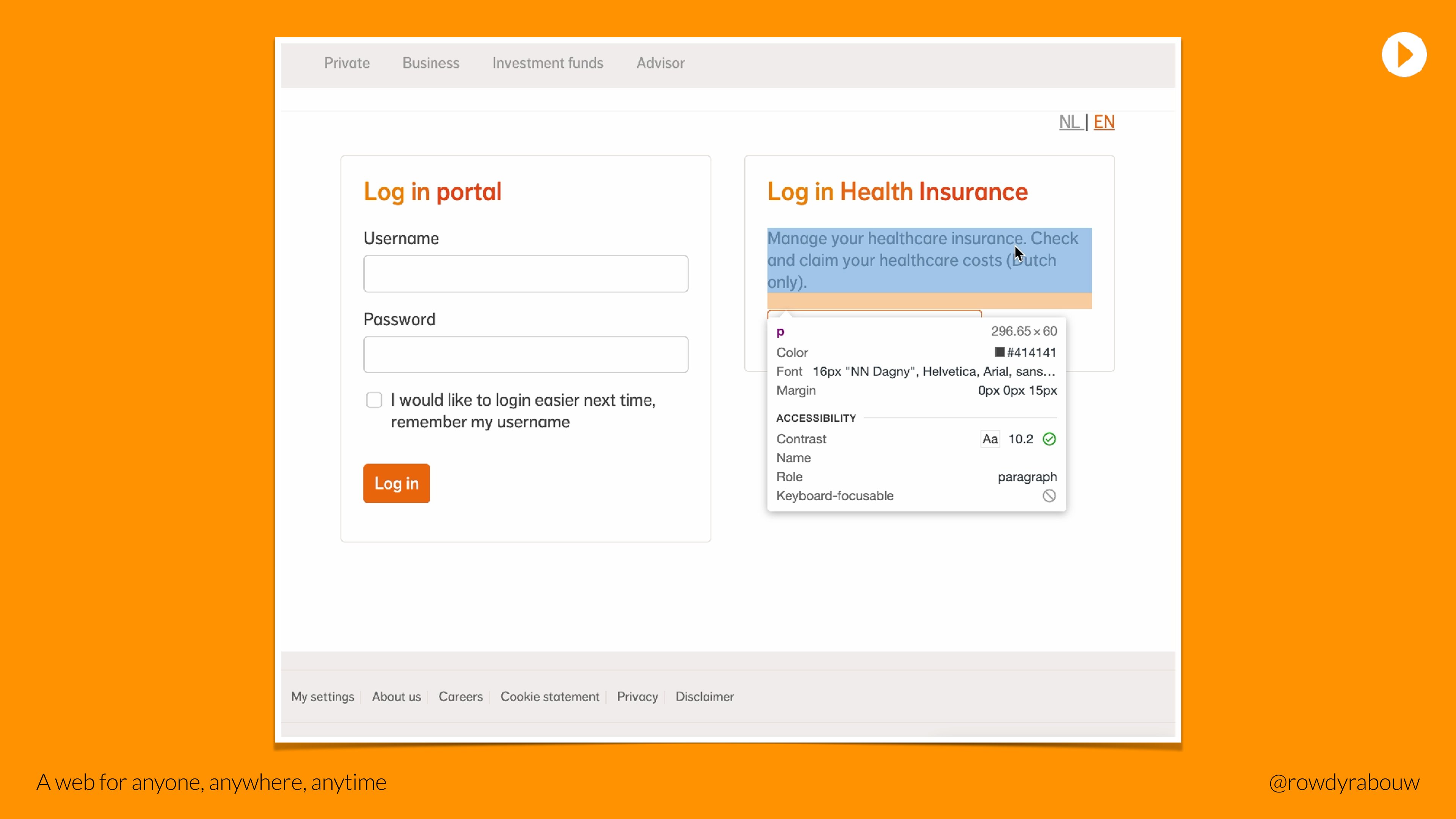In this talk, Rowdy will go over common mistakes and show solutions to improve your website for persons with disabilities. He will also show practical examples to make websites more enjoyable and usable for everyone, based on their current situation.