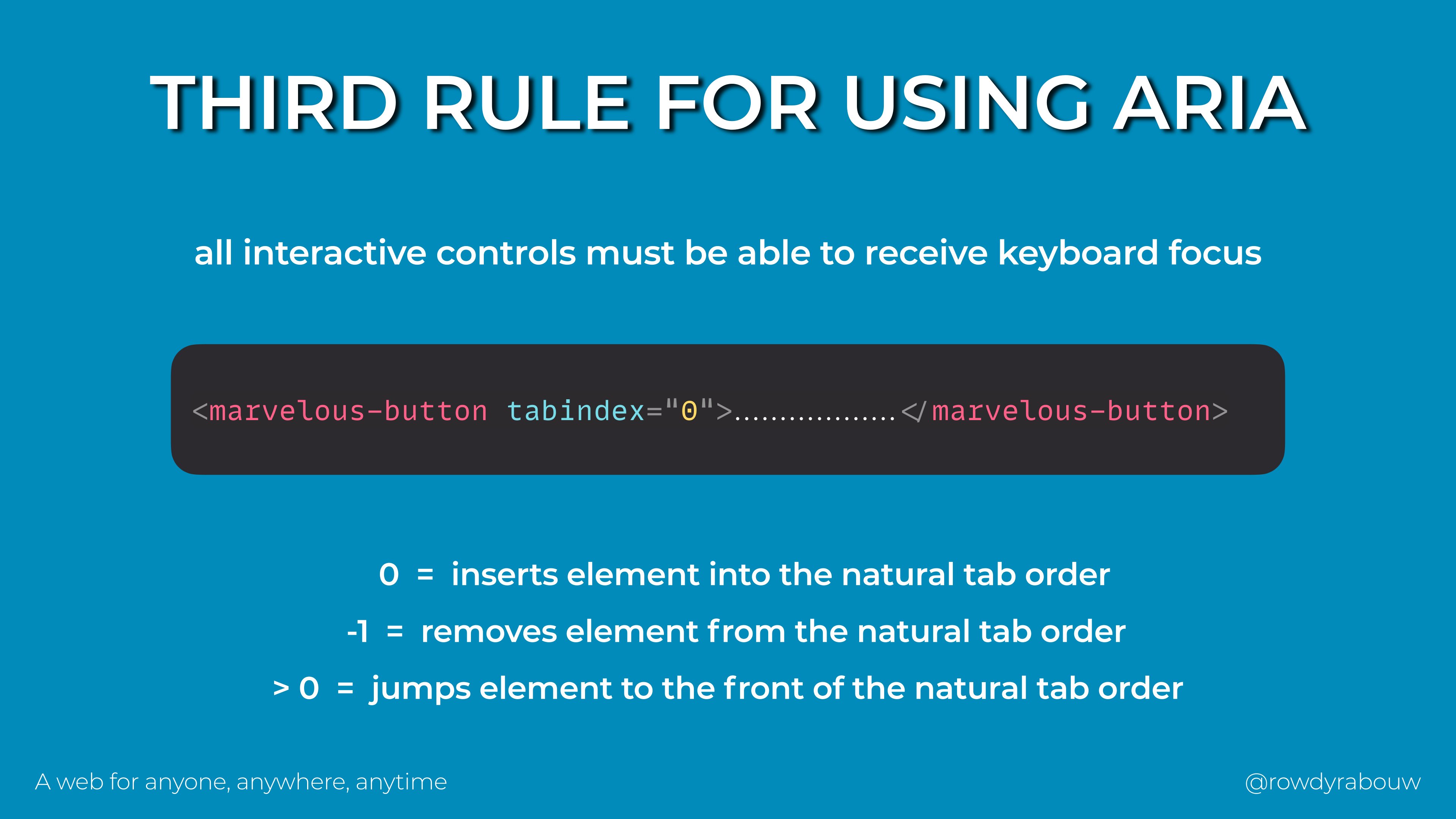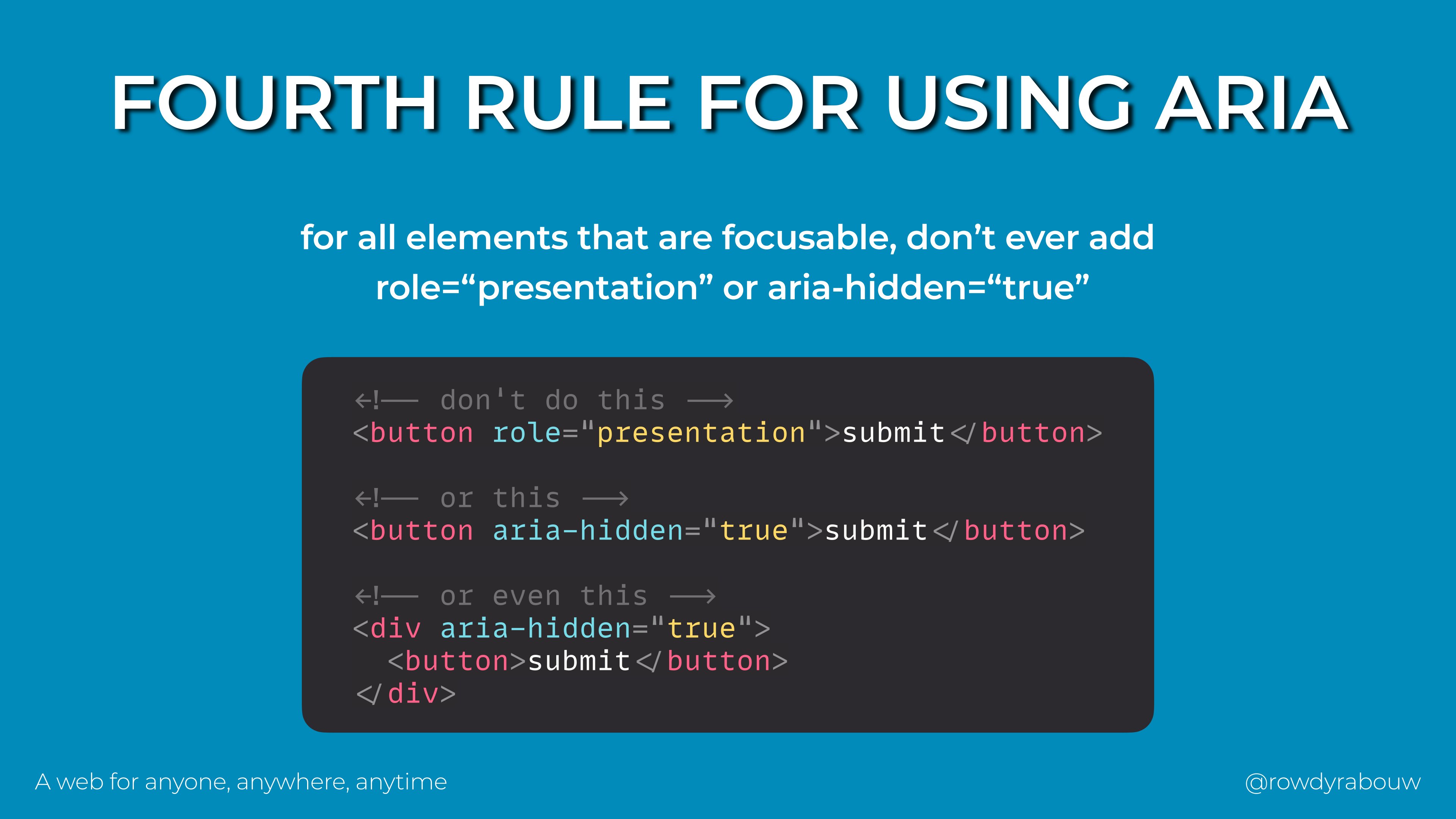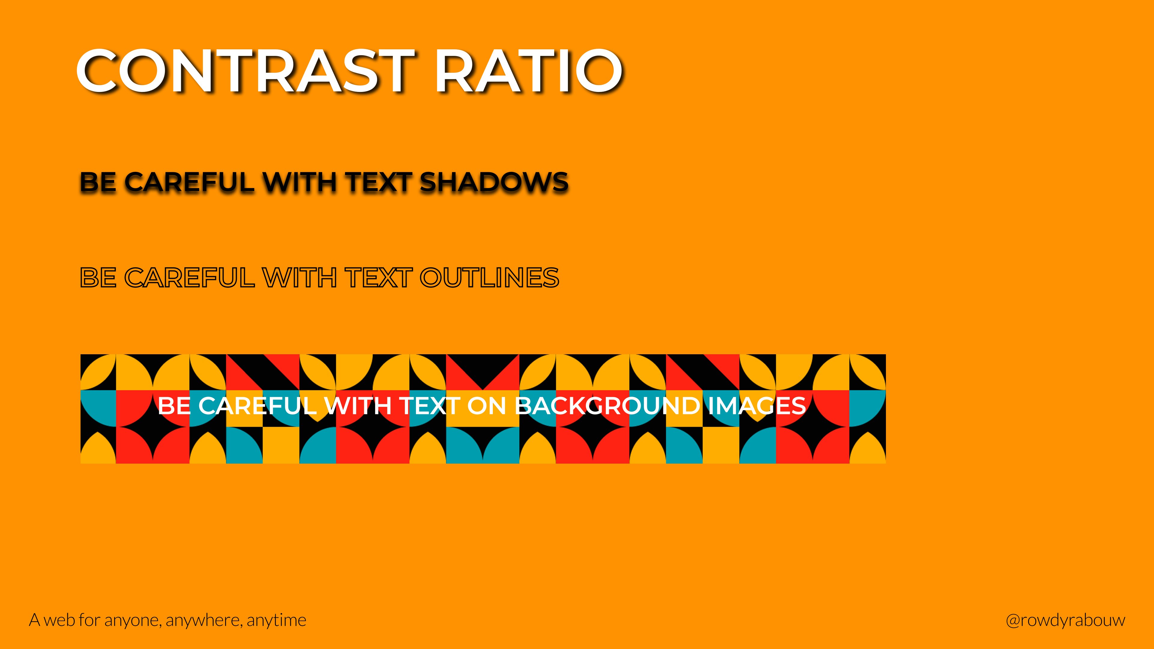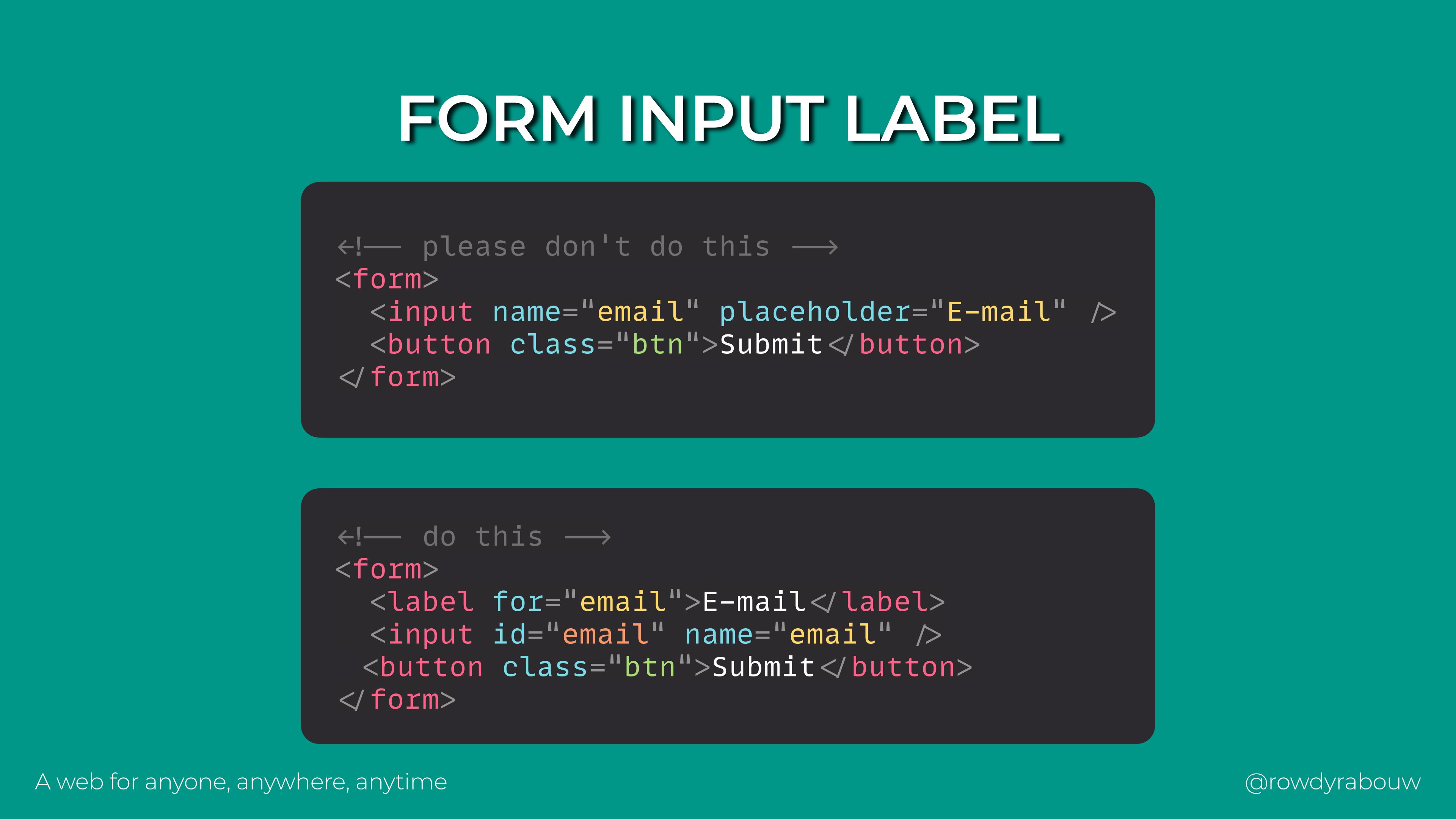 In this talk, Rowdy will go over common mistakes and show solutions to improve your website for persons with disabilities. He will also show practical examples to make websites more enjoyable and usable for everyone, based on their current situation.