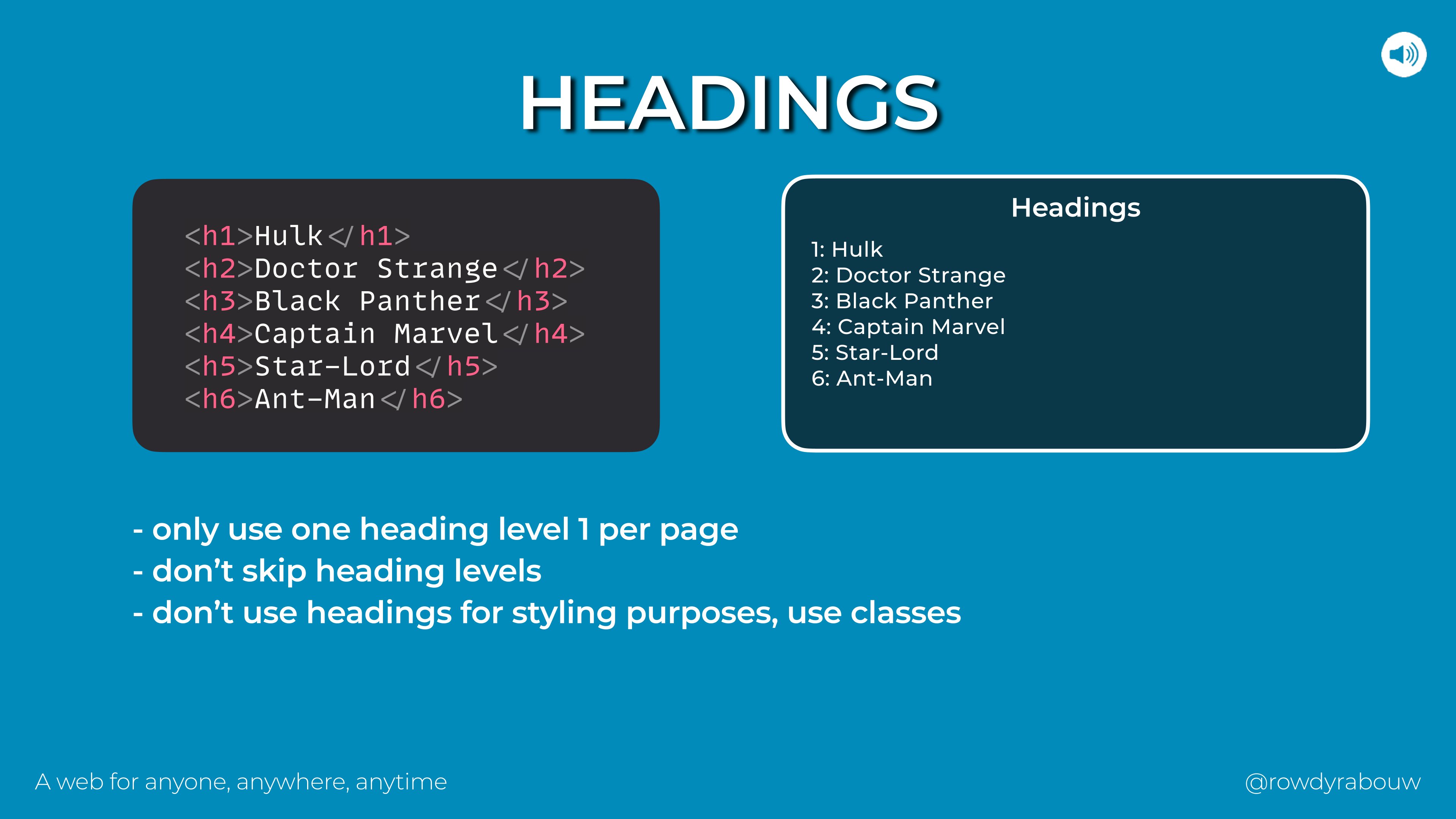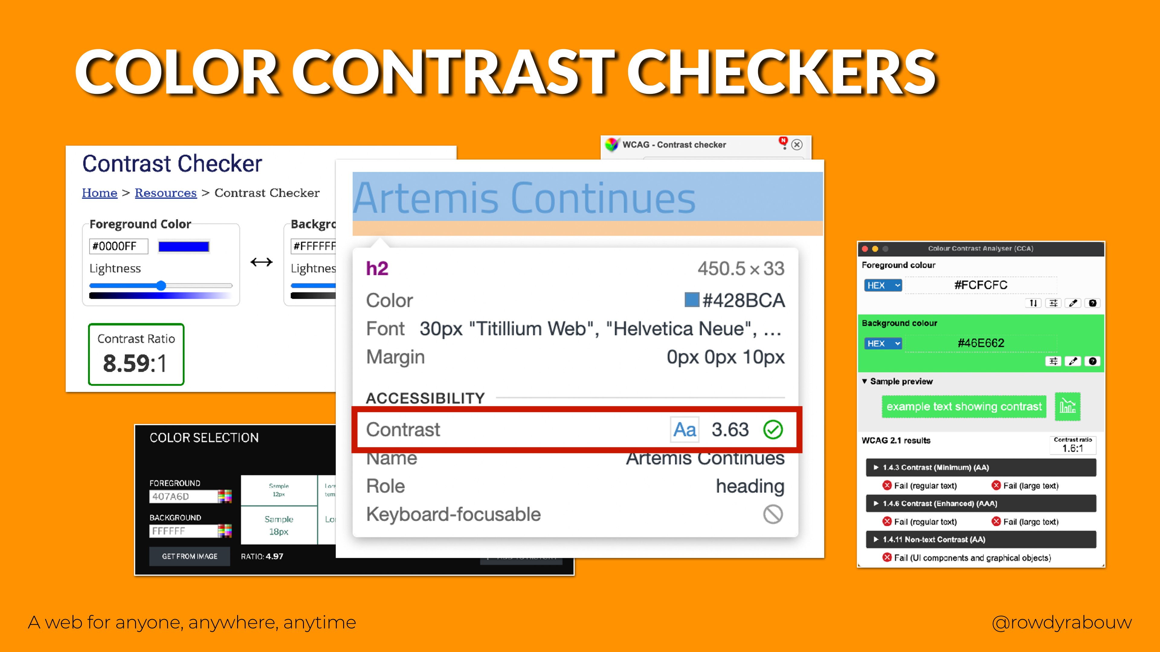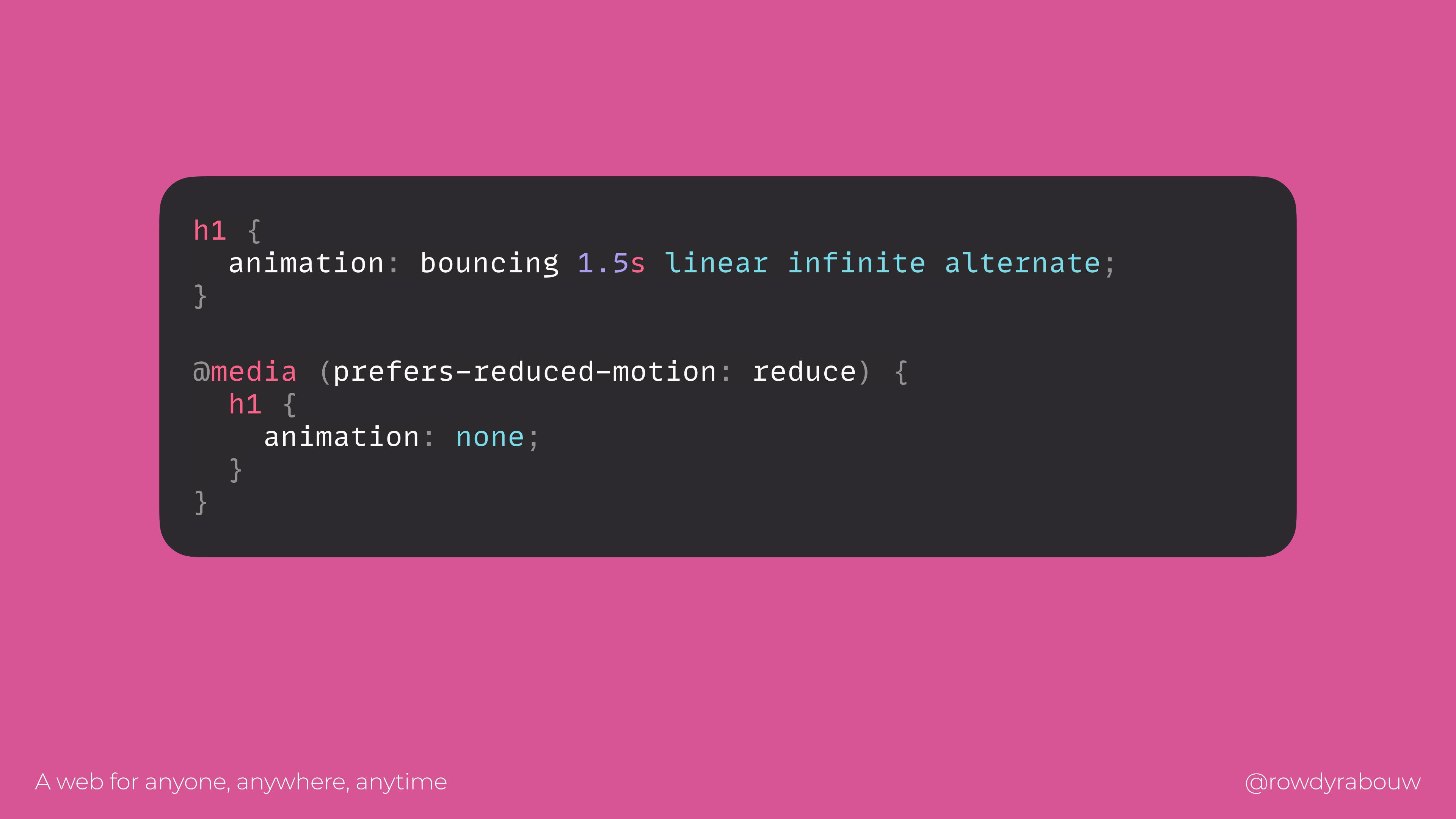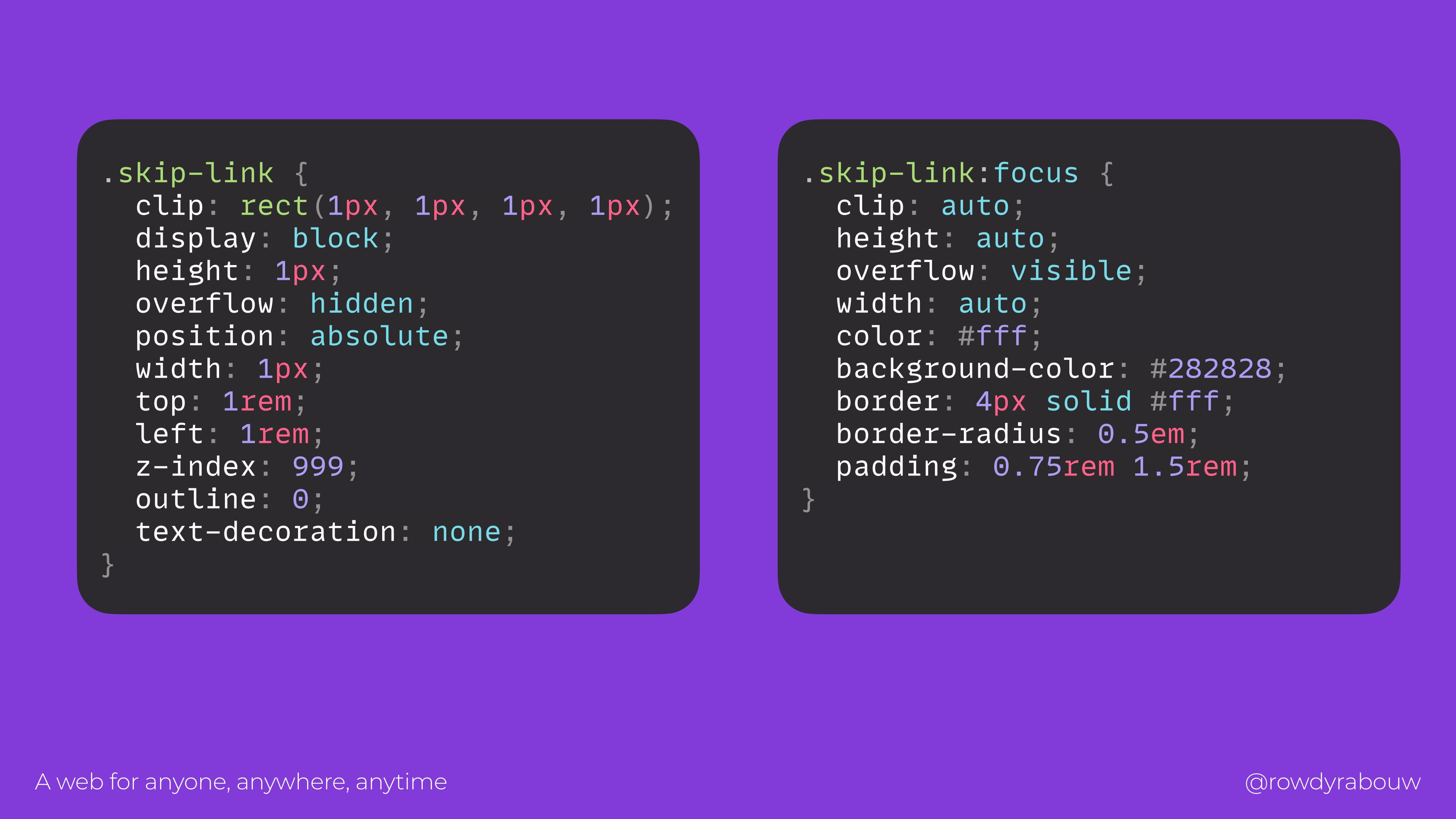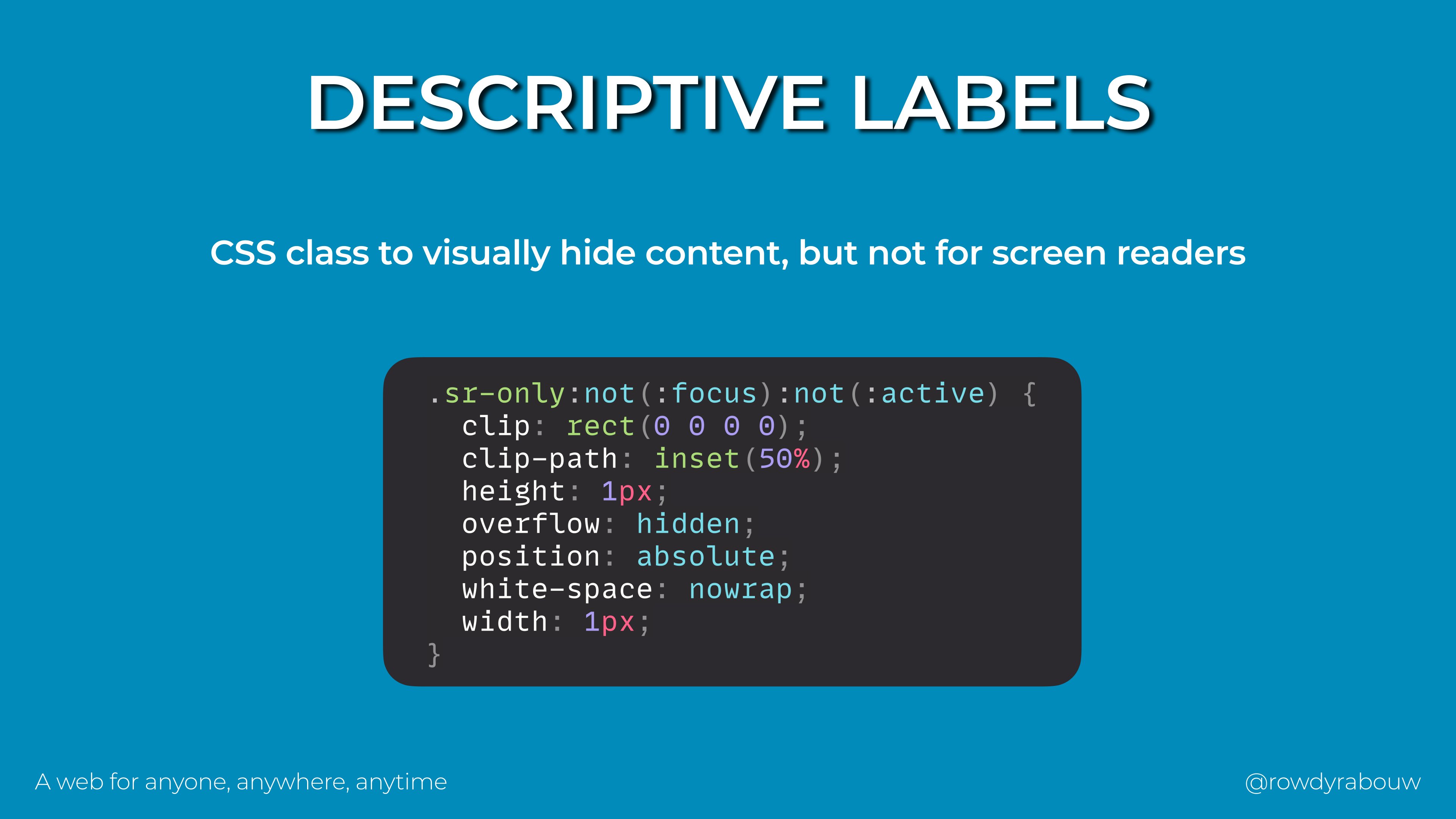 In this talk, Rowdy will go over common mistakes and show solutions to improve your website for persons with disabilities. He will also show practical examples to make websites more enjoyable and usable for everyone, based on their current situation.