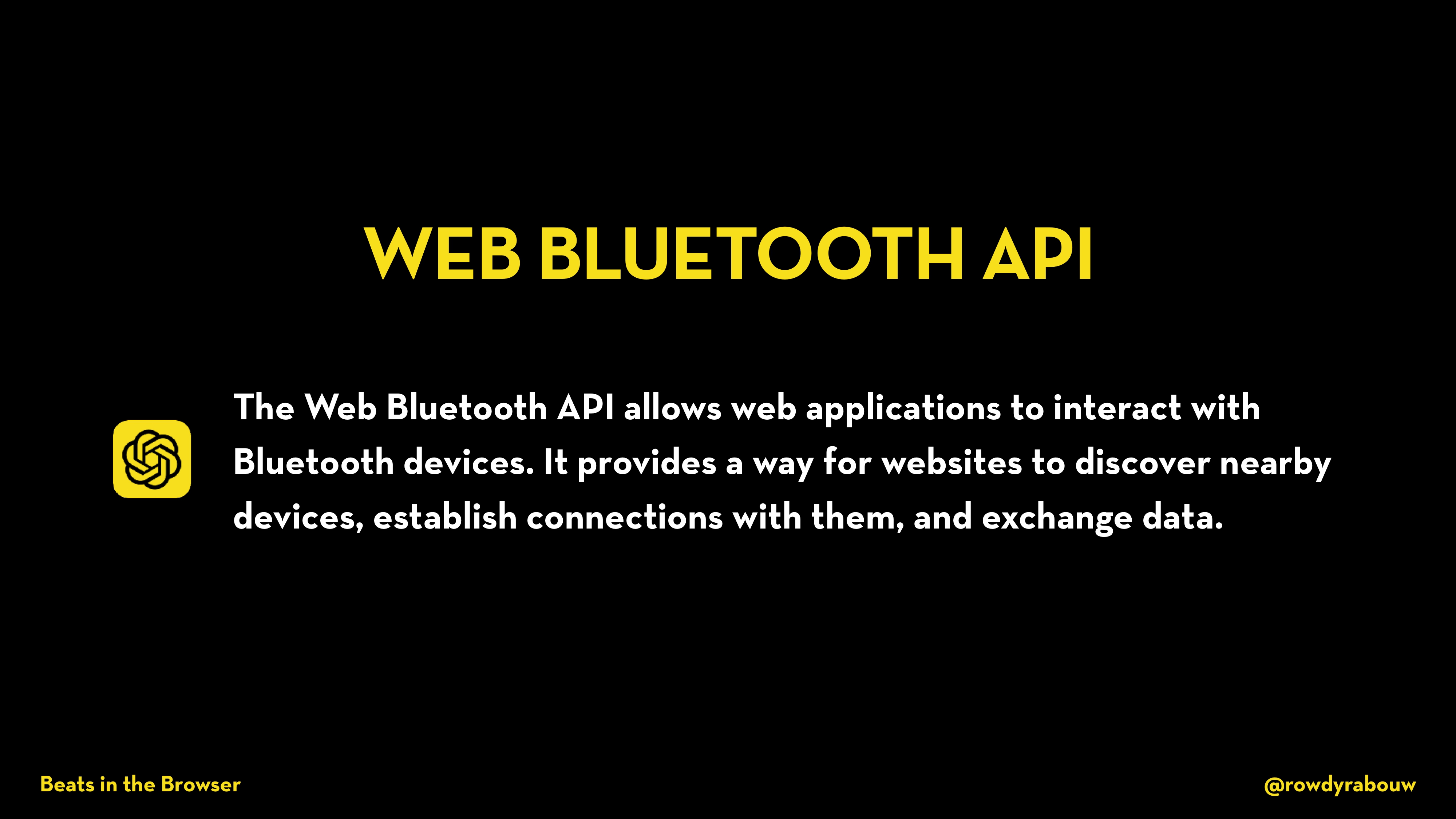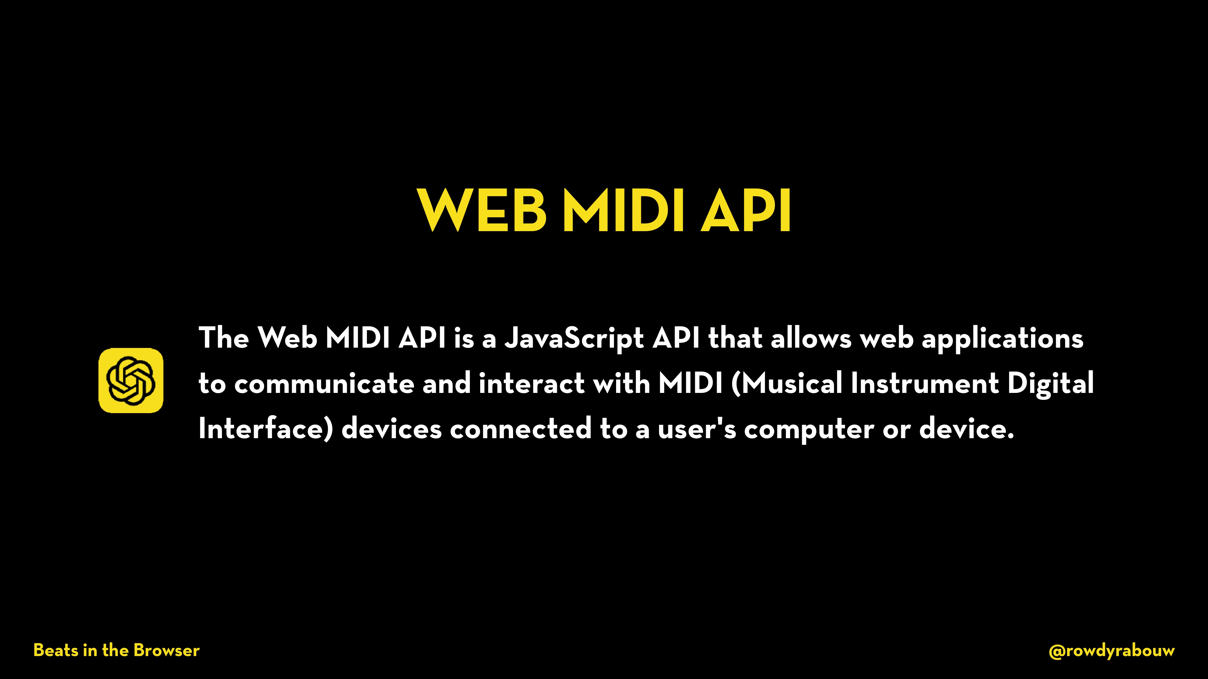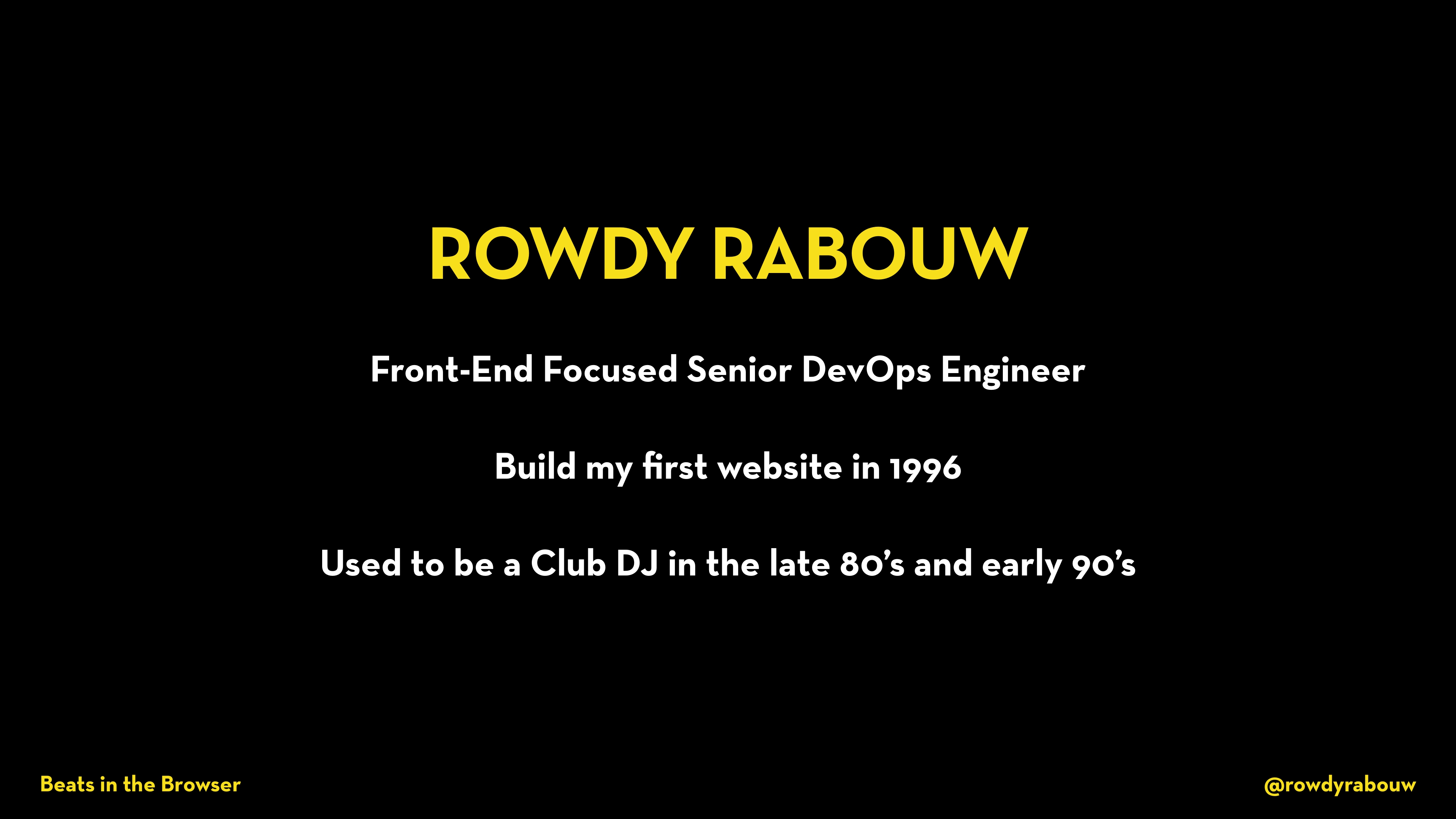 In this talk, Rowdy will show you how easy and fun it is to code your own music with the Web Audio API. As a bonus, he will throw in the Web MIDI API and Web Bluetooth API to really get the party started. Let’s turn up the bass!
