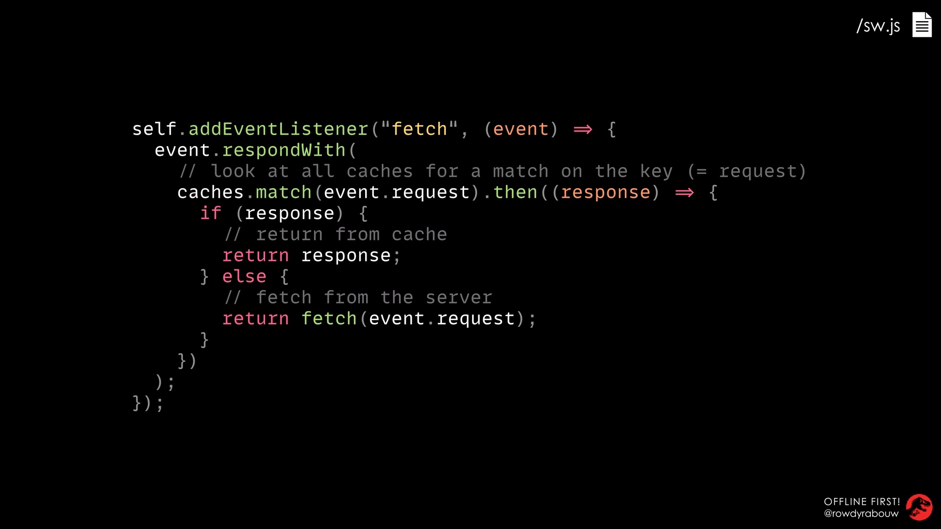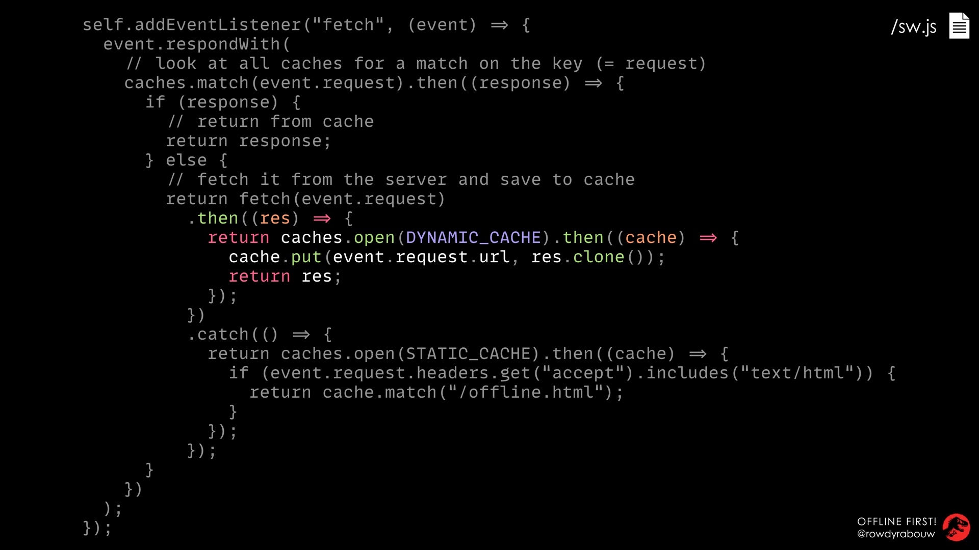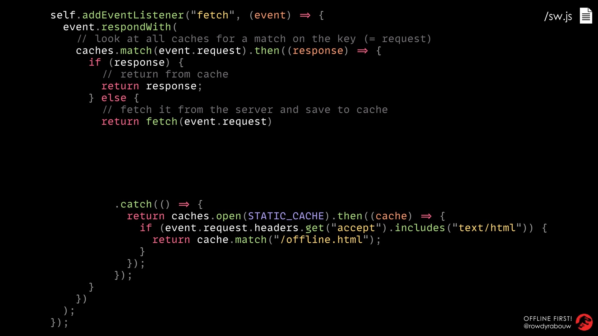 In this talk, Rowdy will look at different caching strategies to boost the performance of your website and how to deal with offline situations using the Cache API and Fetch API. As a bonus, these techniques will save your users’ valuable bandwidth and battery life as well.