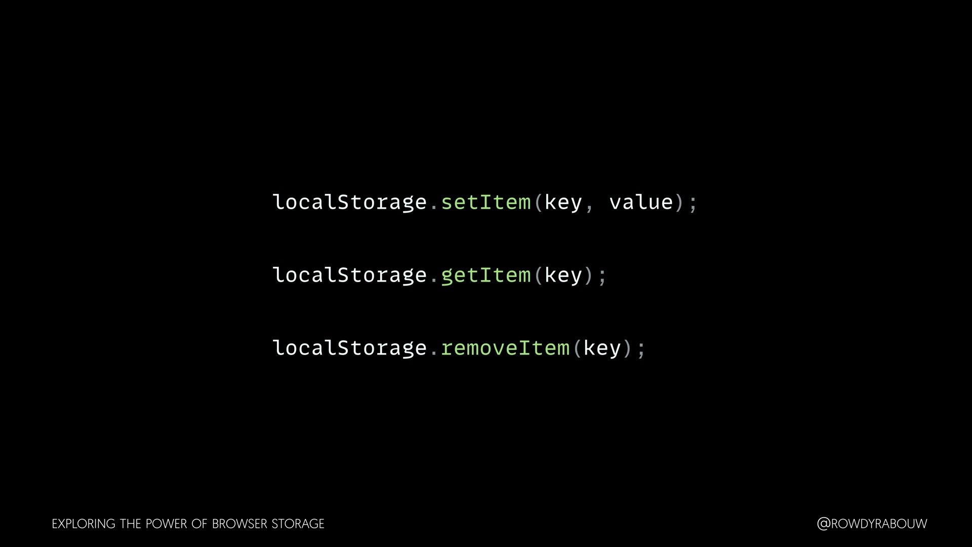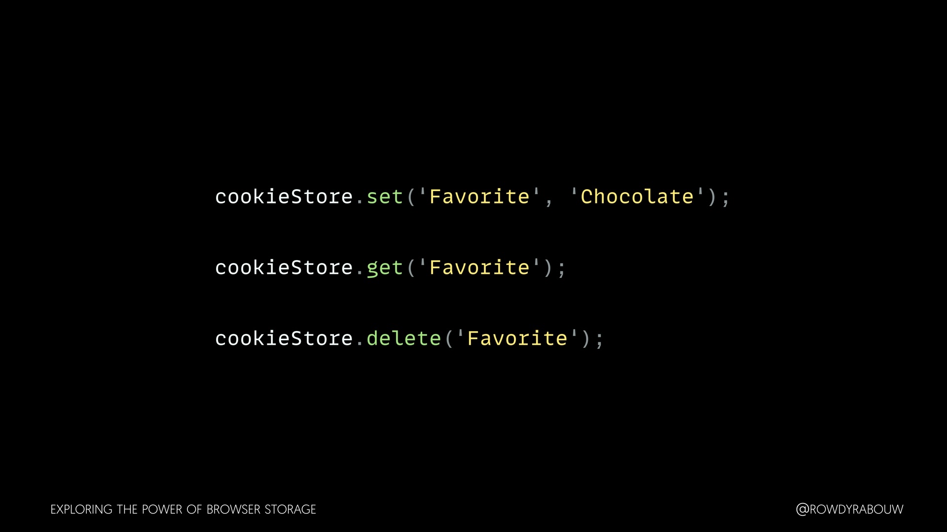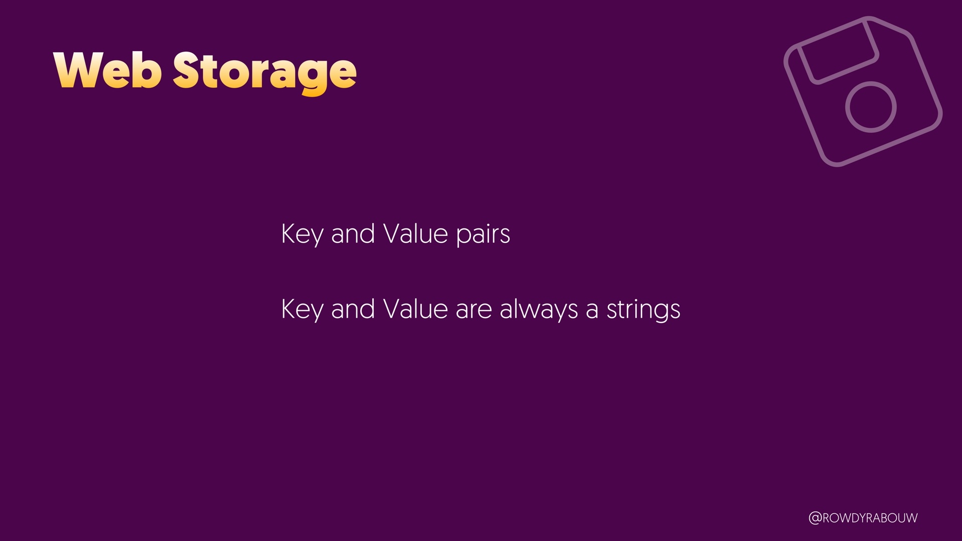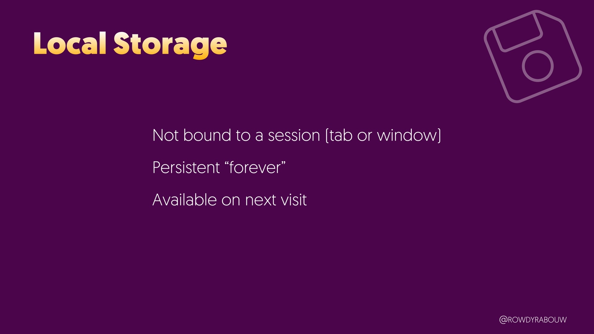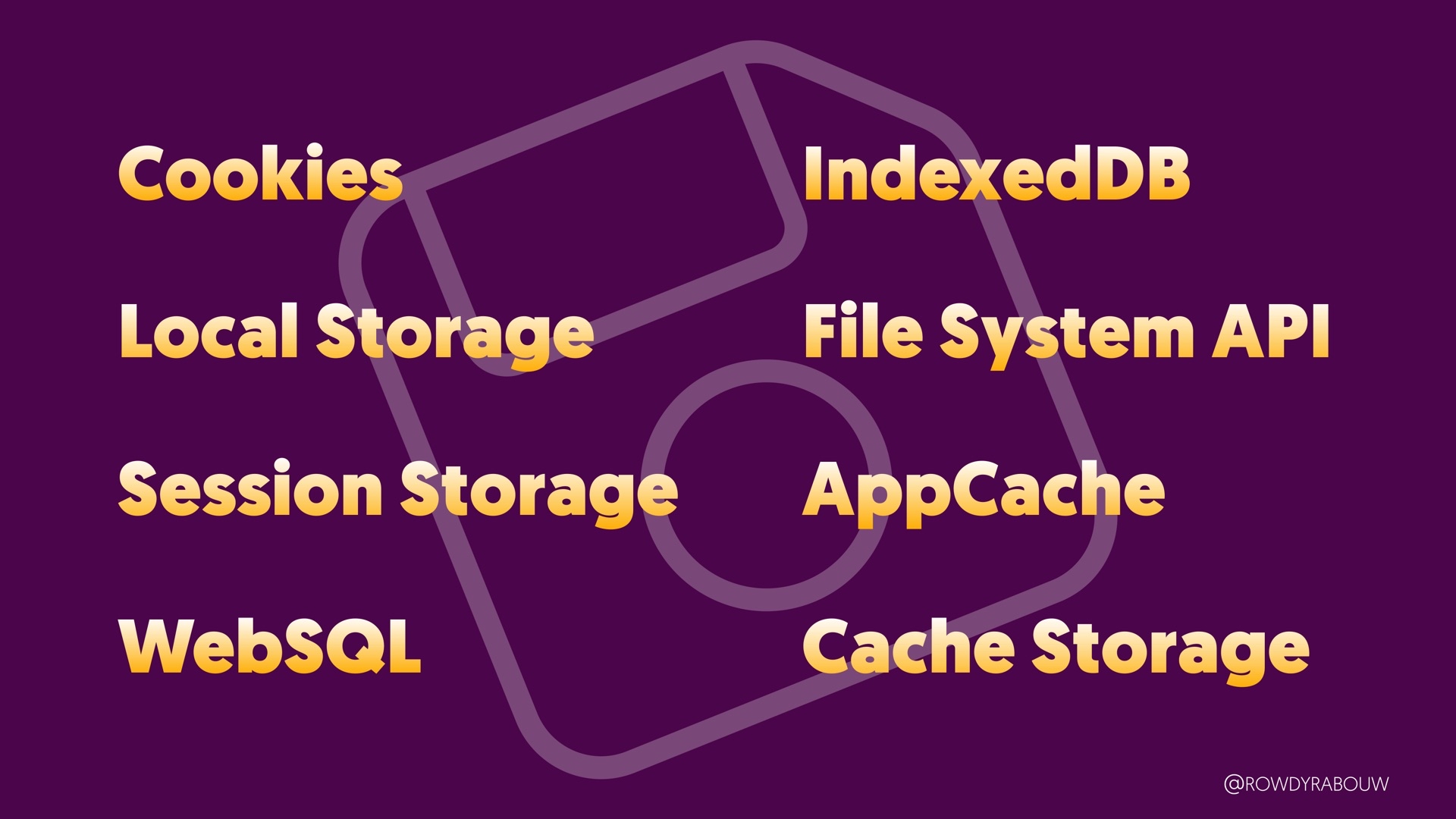 Join Rowdy for a comprehensive talk that will demystify the world of browser storage. In this presentation, we'll explore all the types of storage available to web developers and shed light on how each can be harnessed to enhance your web applications.