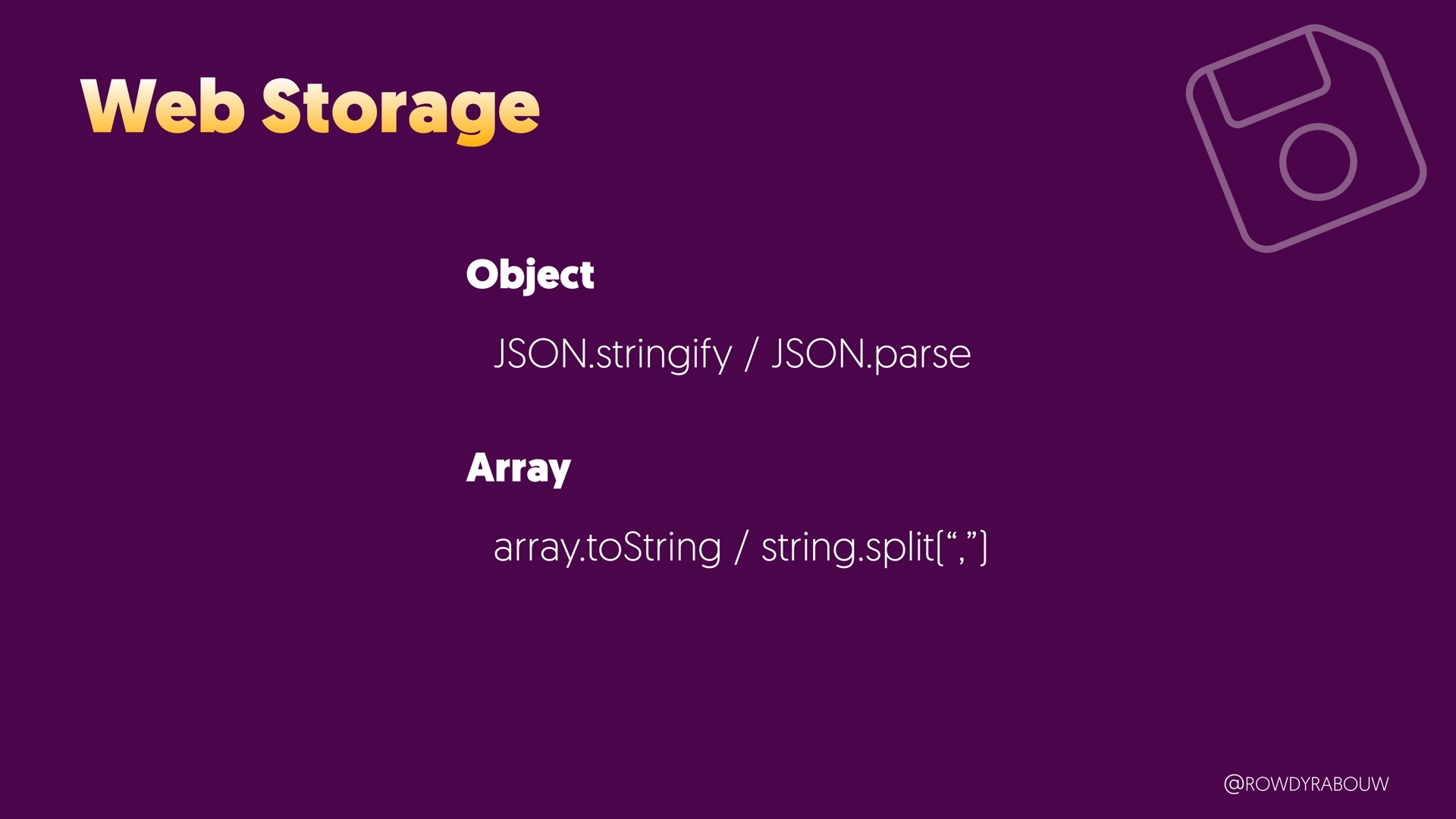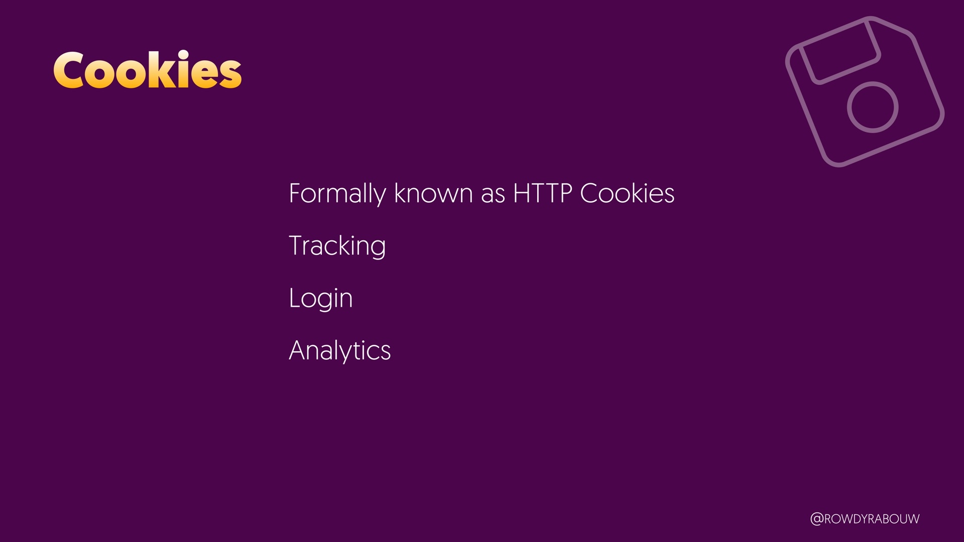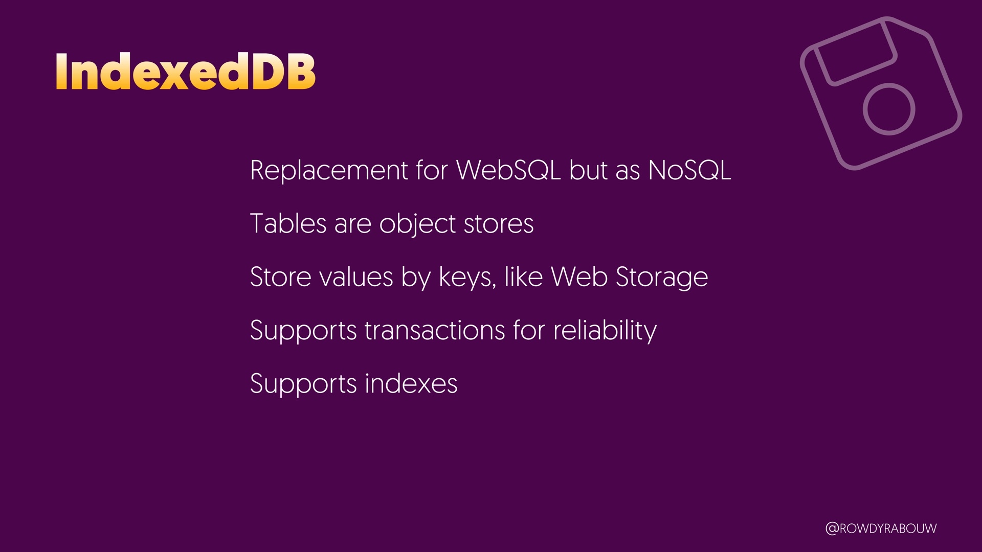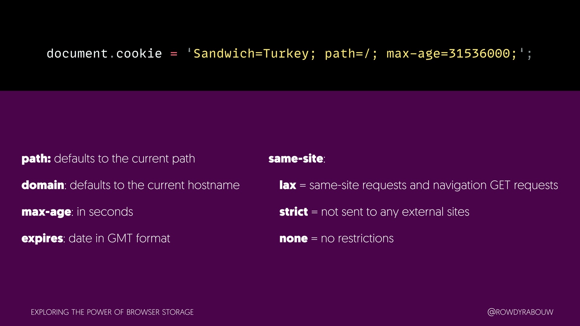 Join Rowdy for a comprehensive talk that will demystify the world of browser storage. In this presentation, we'll explore all the types of storage available to web developers and shed light on how each can be harnessed to enhance your web applications.