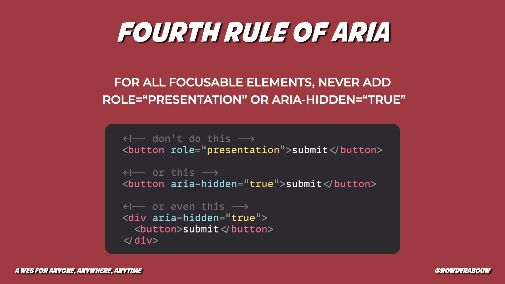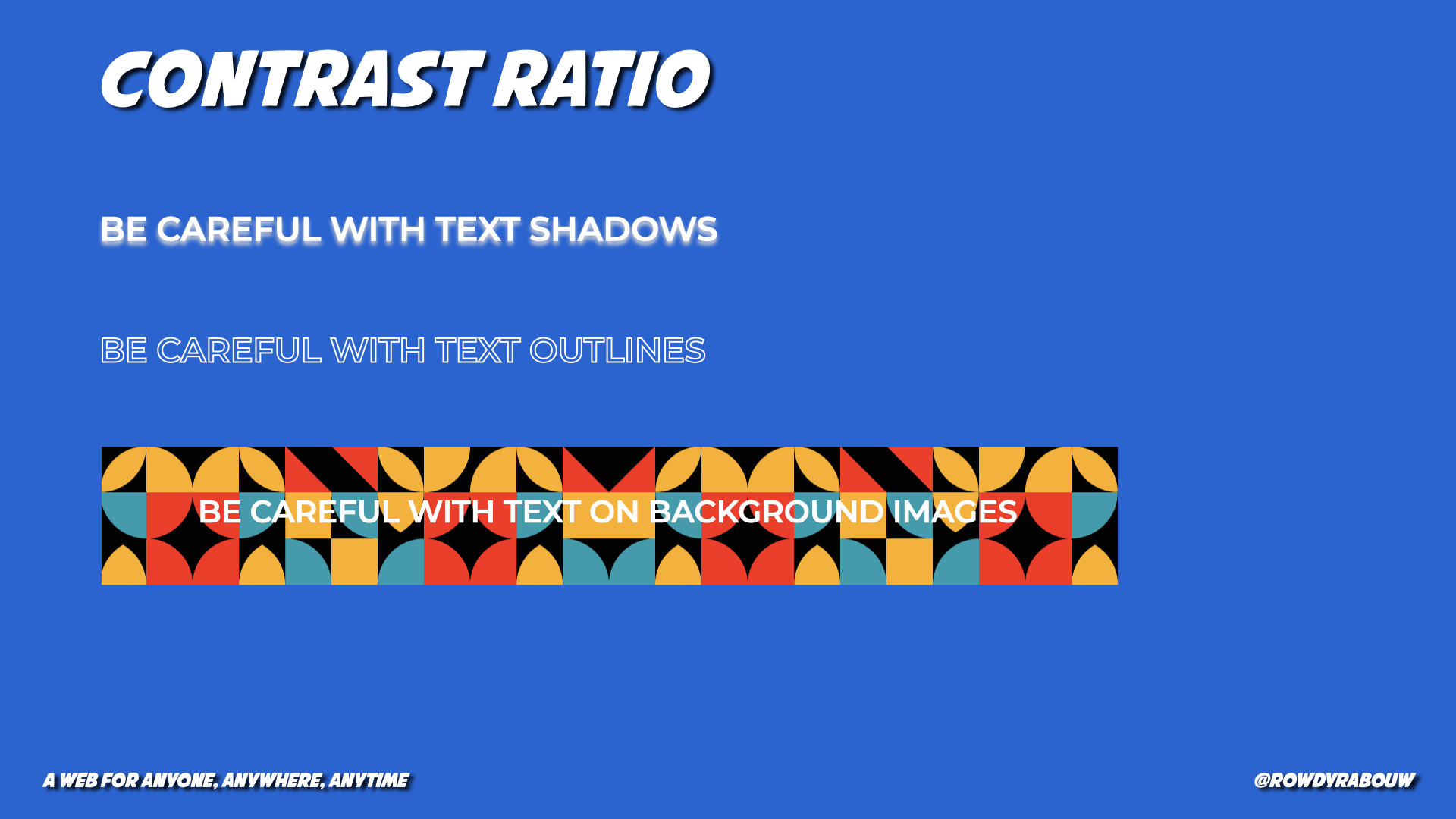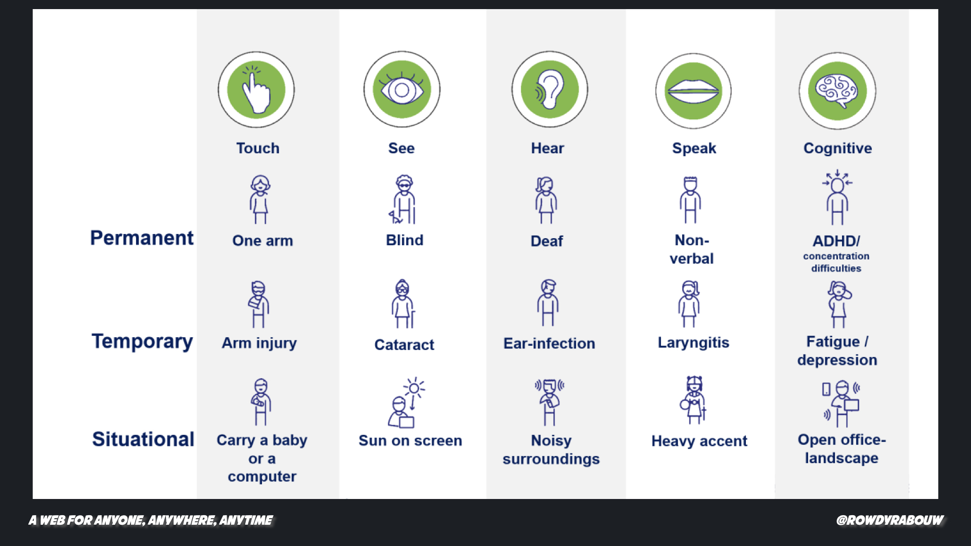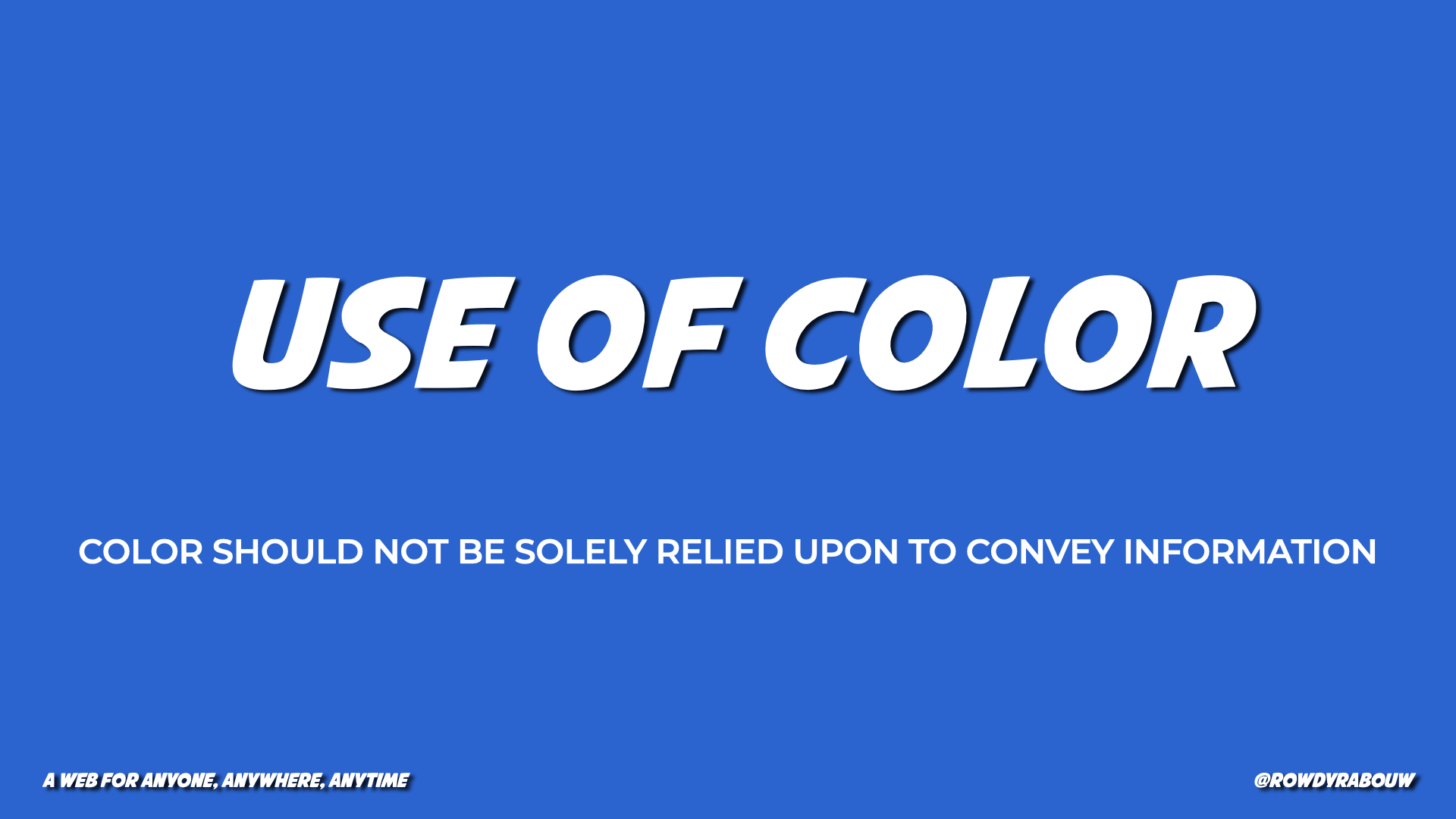 In this talk, Rowdy will go over common mistakes and show solutions to improve your website for persons with disabilities. He will also show practical examples to make websites more enjoyable and usable for everyone, based on their current situation.