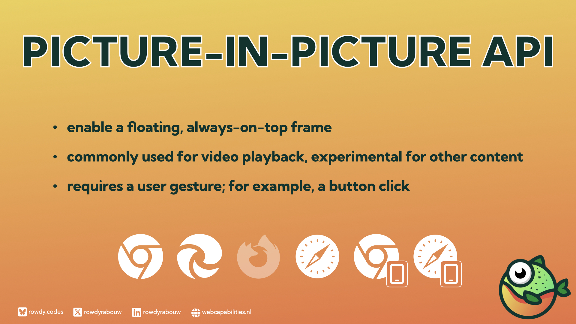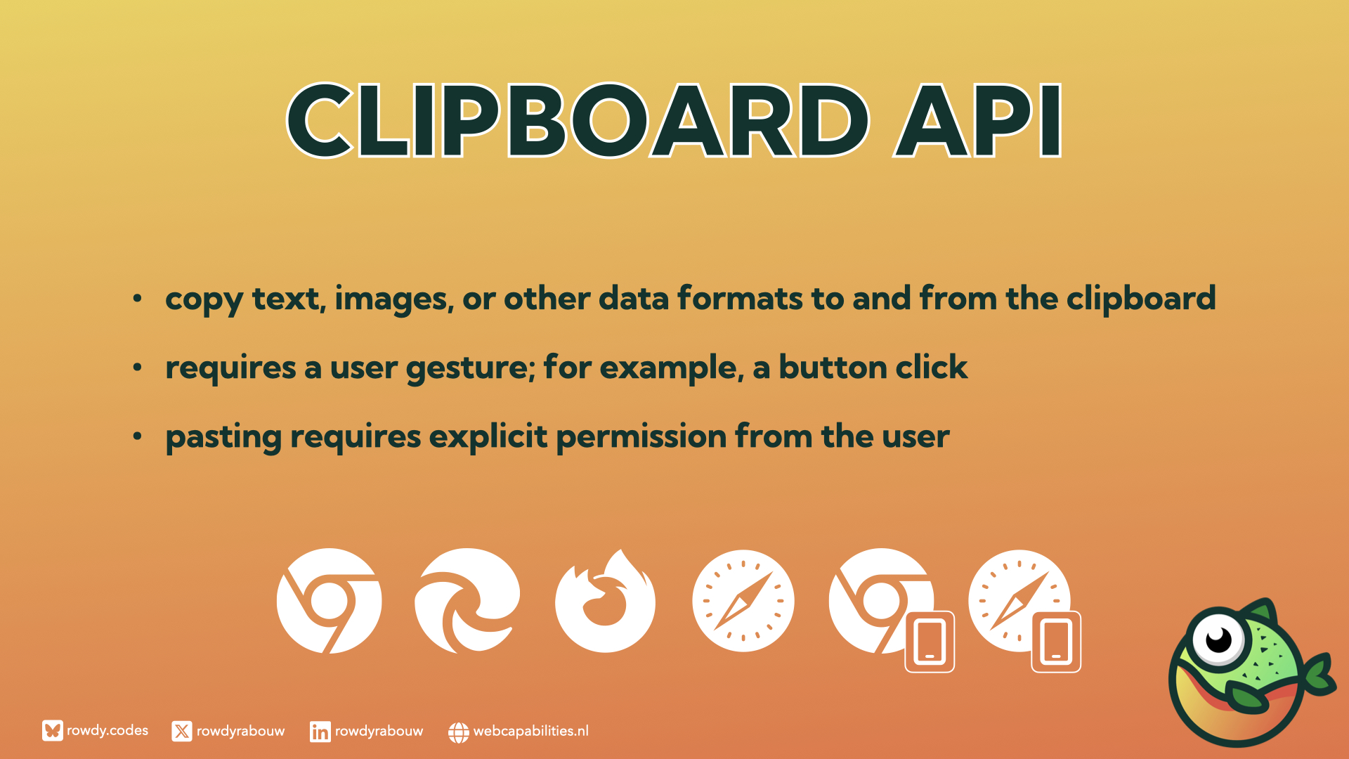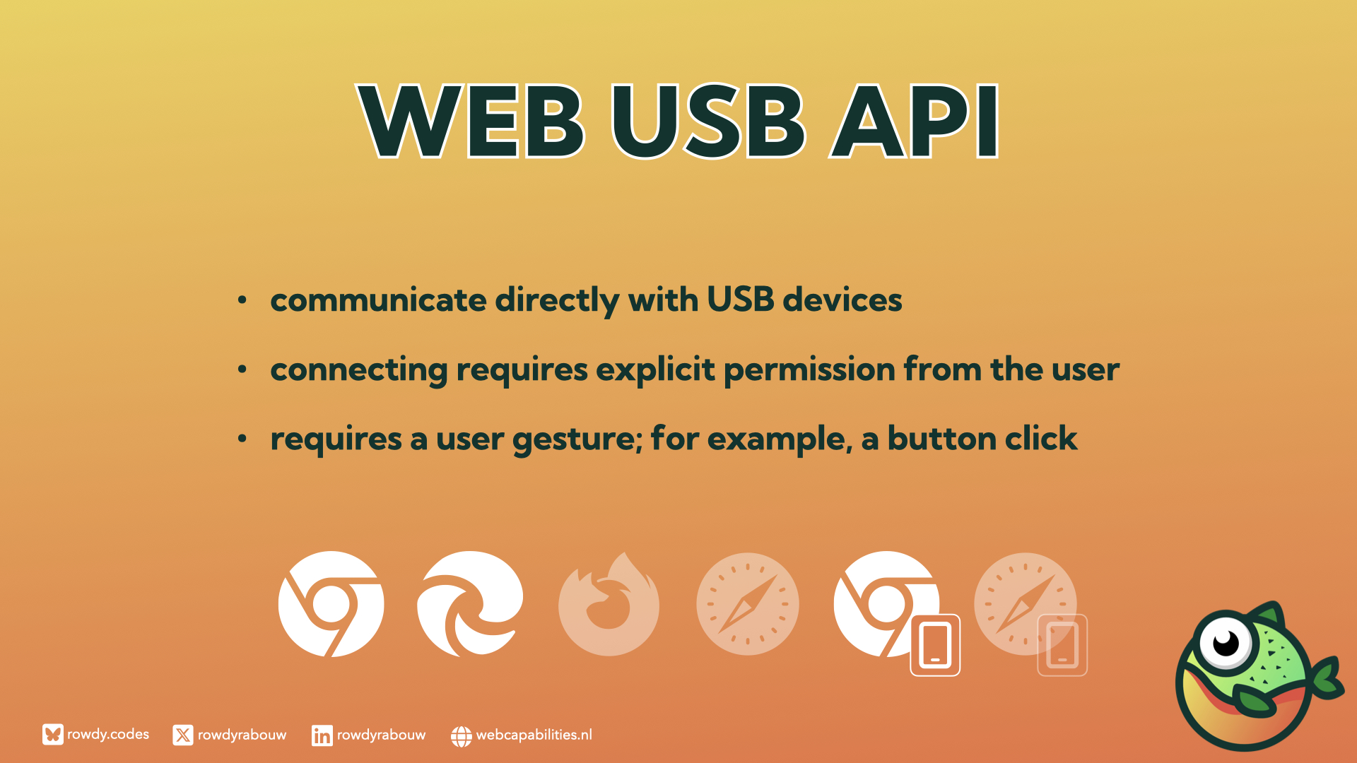 This session will explore how these innovations transform the web development landscape. Attendees will learn about APIs such as Clipboard, Picture-in-Picture, Web Share, Web USB, and Web Bluetooth.
