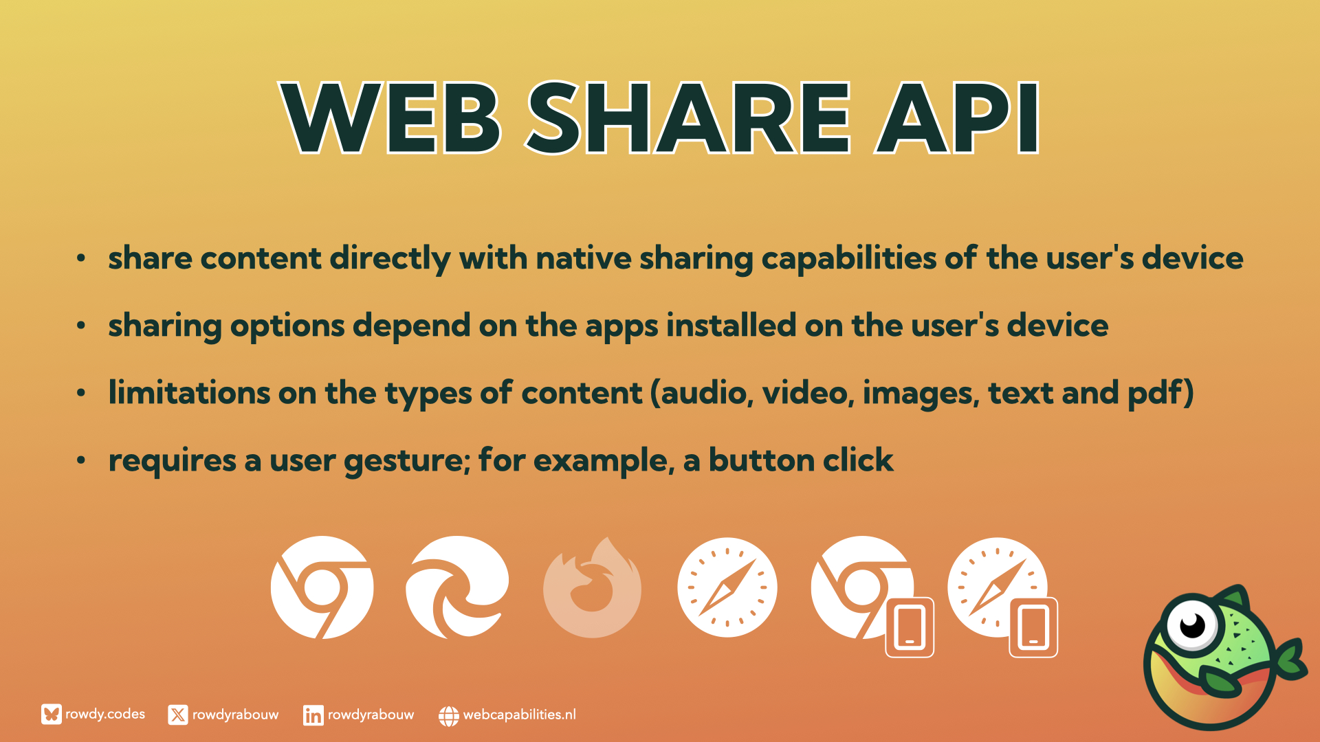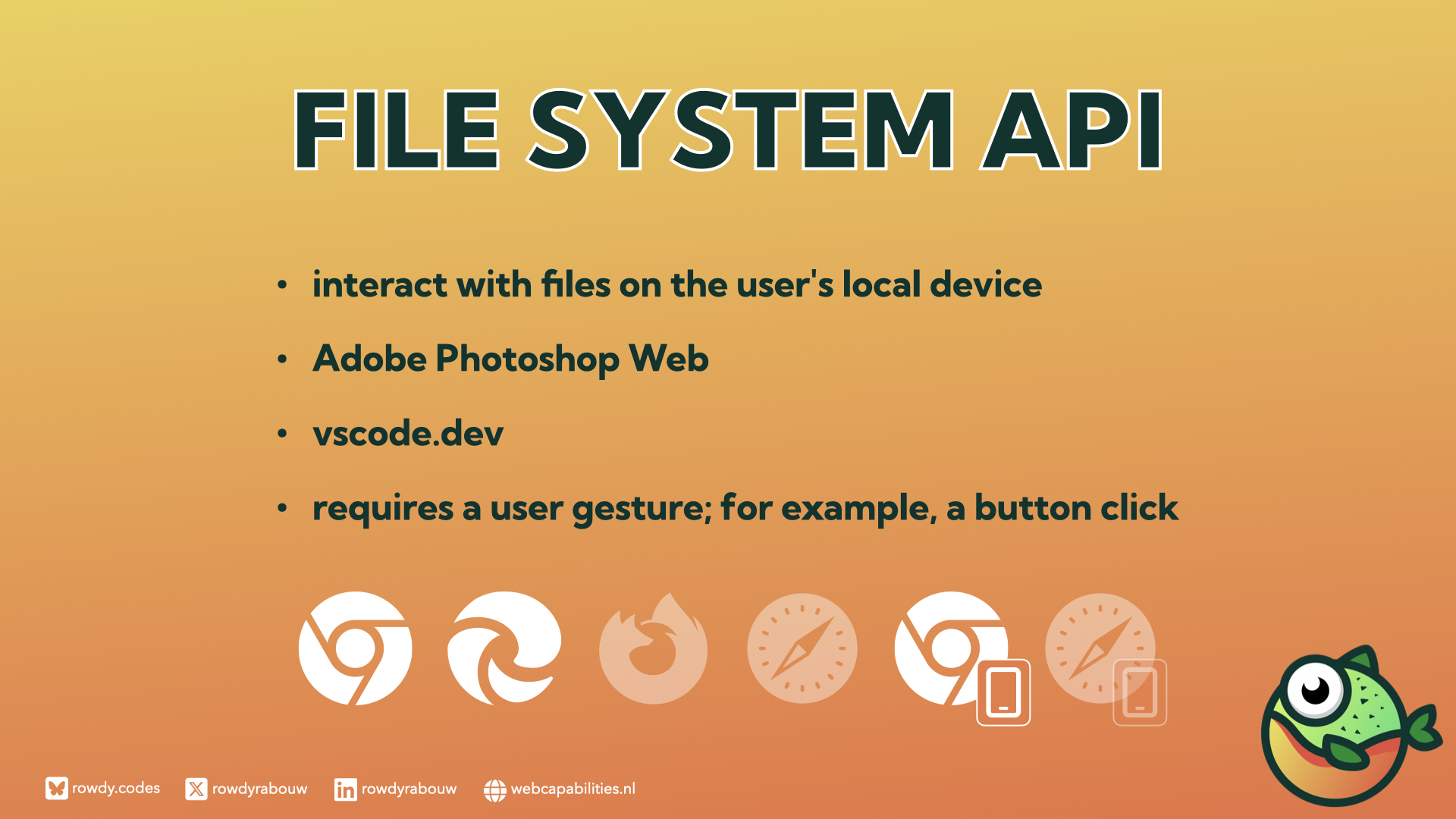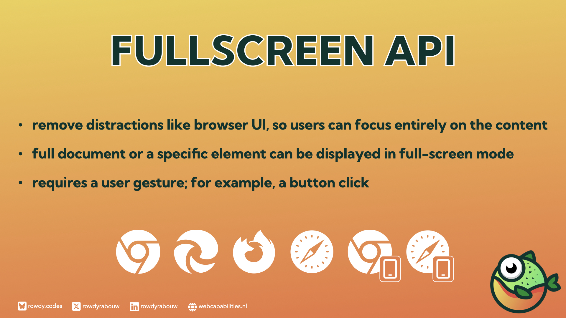This session will explore how these innovations transform the web development landscape. Attendees will learn about APIs such as Clipboard, Picture-in-Picture, Web Share, Web USB, and Web Bluetooth.